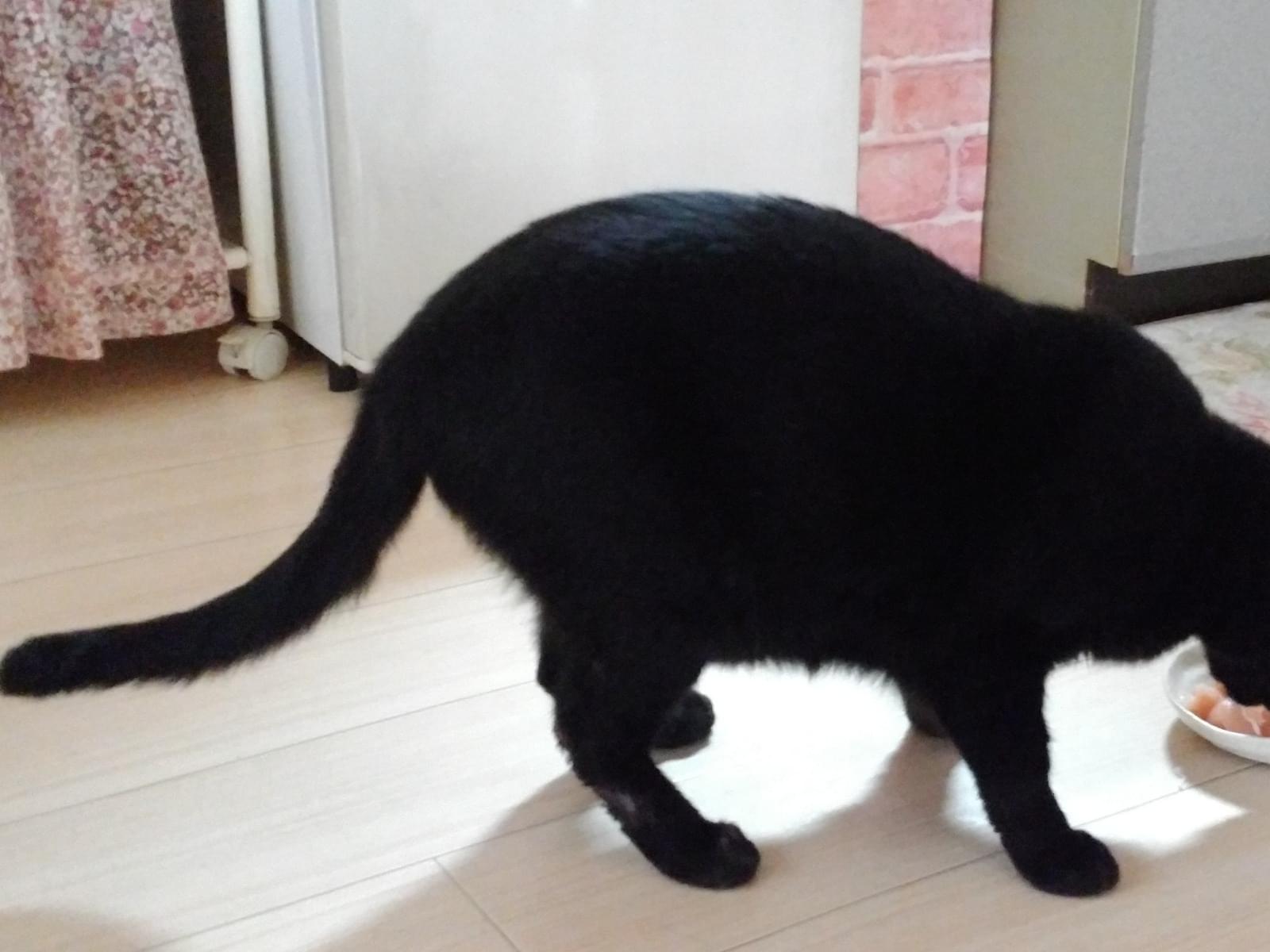 体が大きく手足や尻尾が長い黒猫、去勢済み耳カットなし