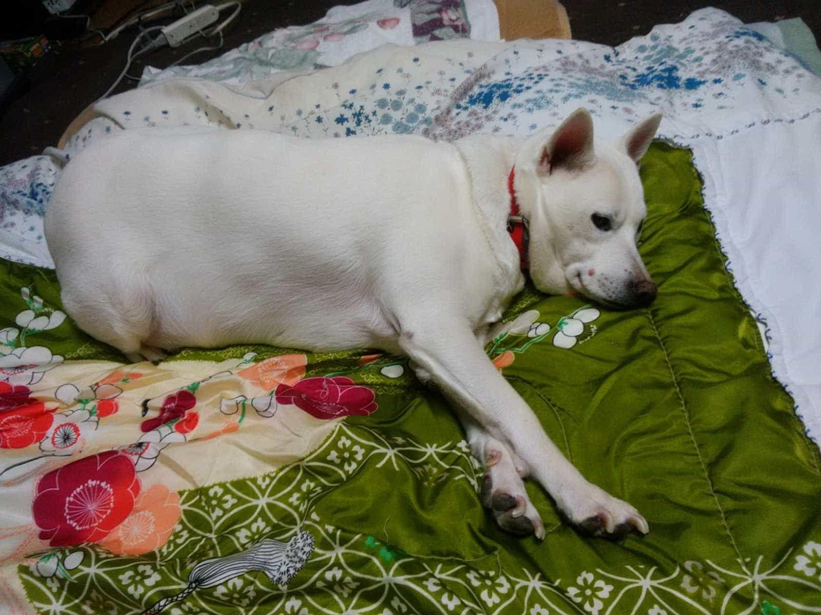 メスのMIX犬、毛色は白、年齢は12歳、中型犬、口のあたりに大きな吹き出物があります