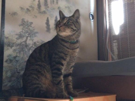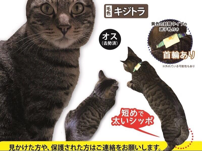 キジトラ、オス(去勢済)、青と黄色の縞模様の首輪を付けていました(外れている可能性あり)