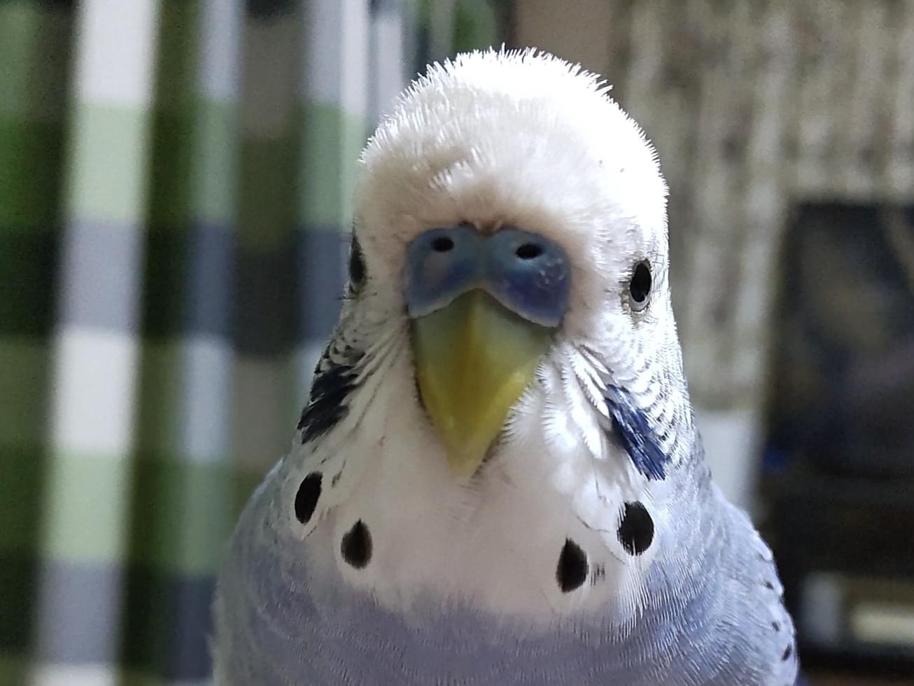 全体的に薄い水色で羽は黒のまだら模様です。人によく懐いていて頭や肩、手にのります。「みーちゃん、あーちゃん」と話します。首をさわってあげると気持ち良さそうにします。