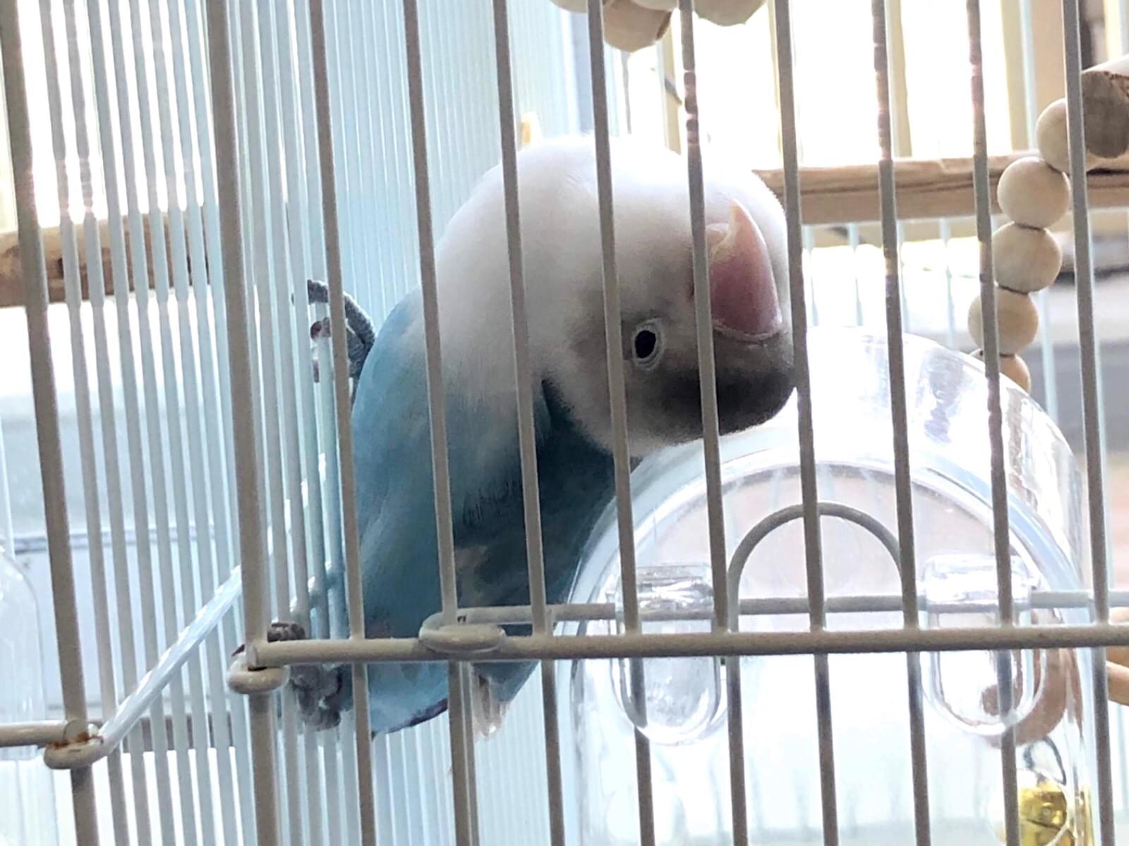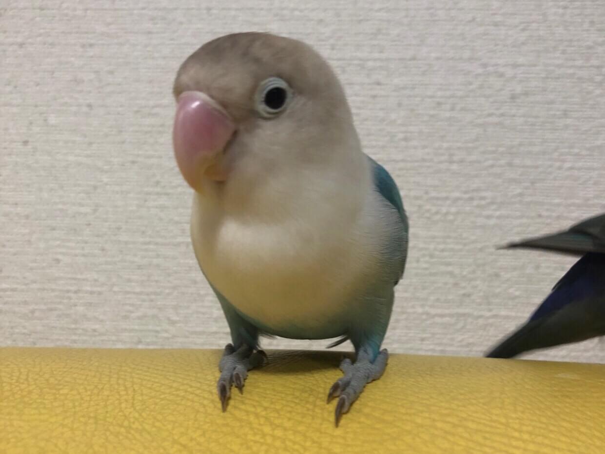 見た目は、くちばしがピンクで顔はグレー、胸は白く胴体、羽共に水色の綺麗なオスの白ボタンインコです。