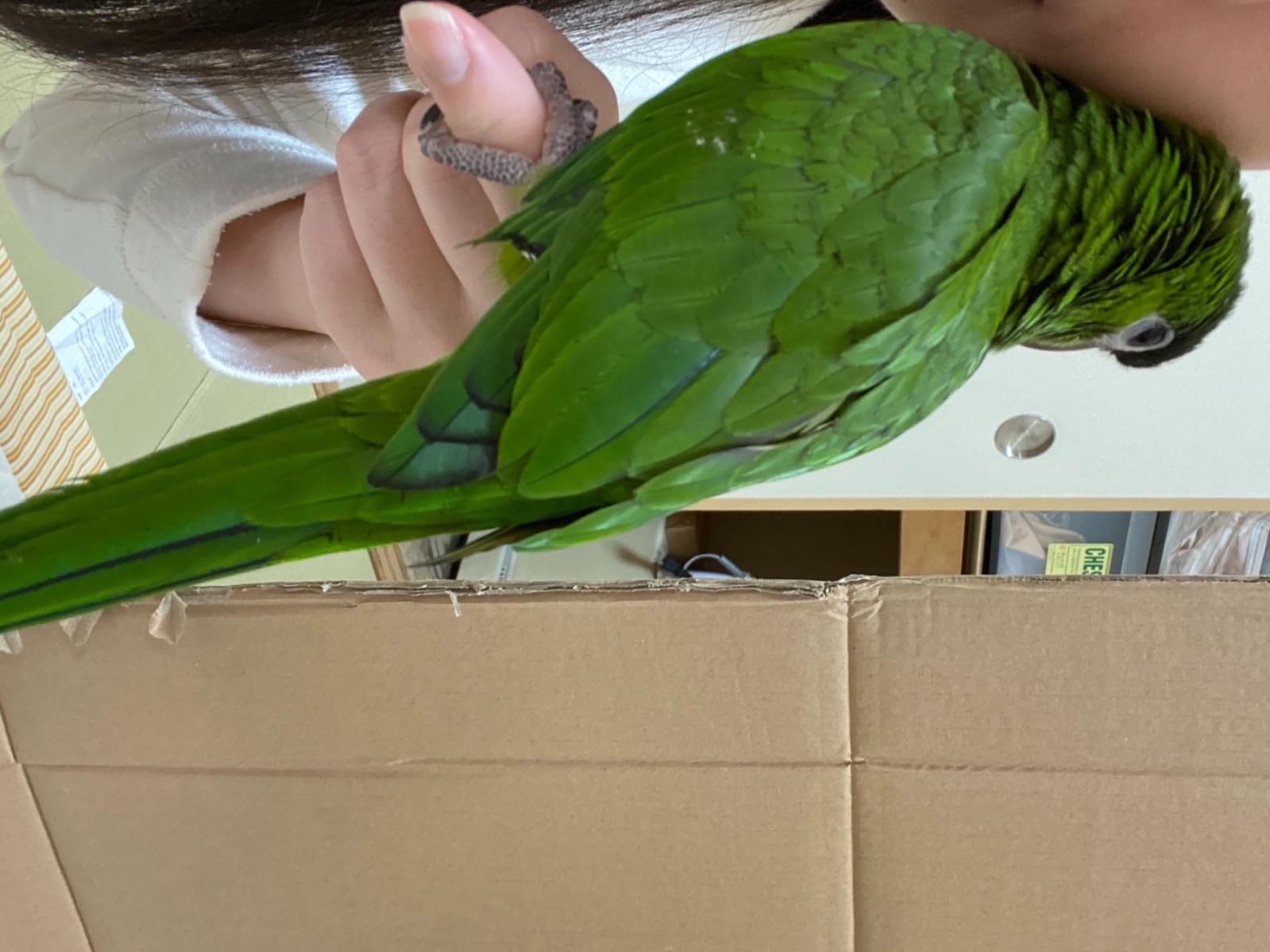 声は大きく、恥ずかしがり屋の性格ですが手乗りインコです。足首に青色の足輪をつけています。