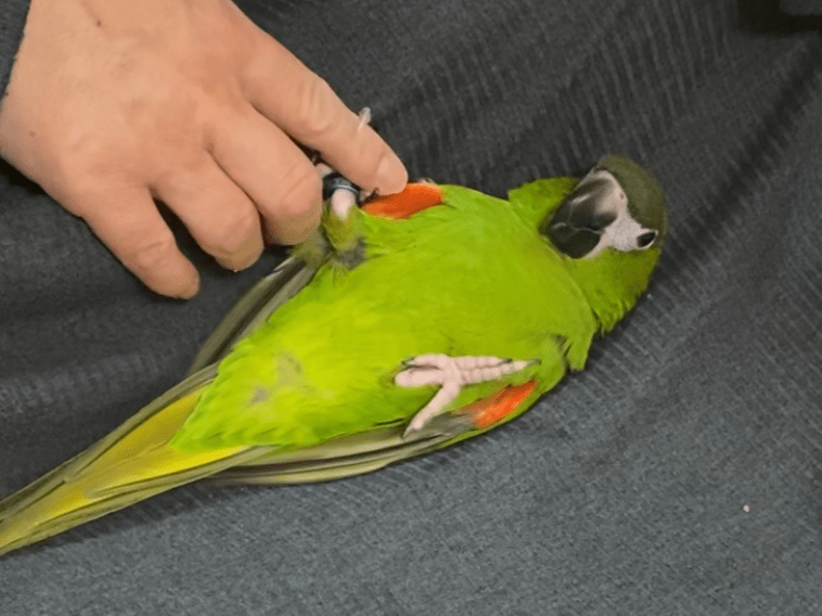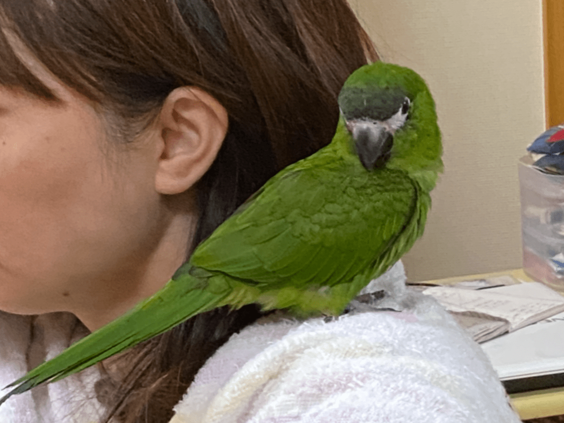 緑色をしていて肩の部分だけ赤色の羽が混じっています。