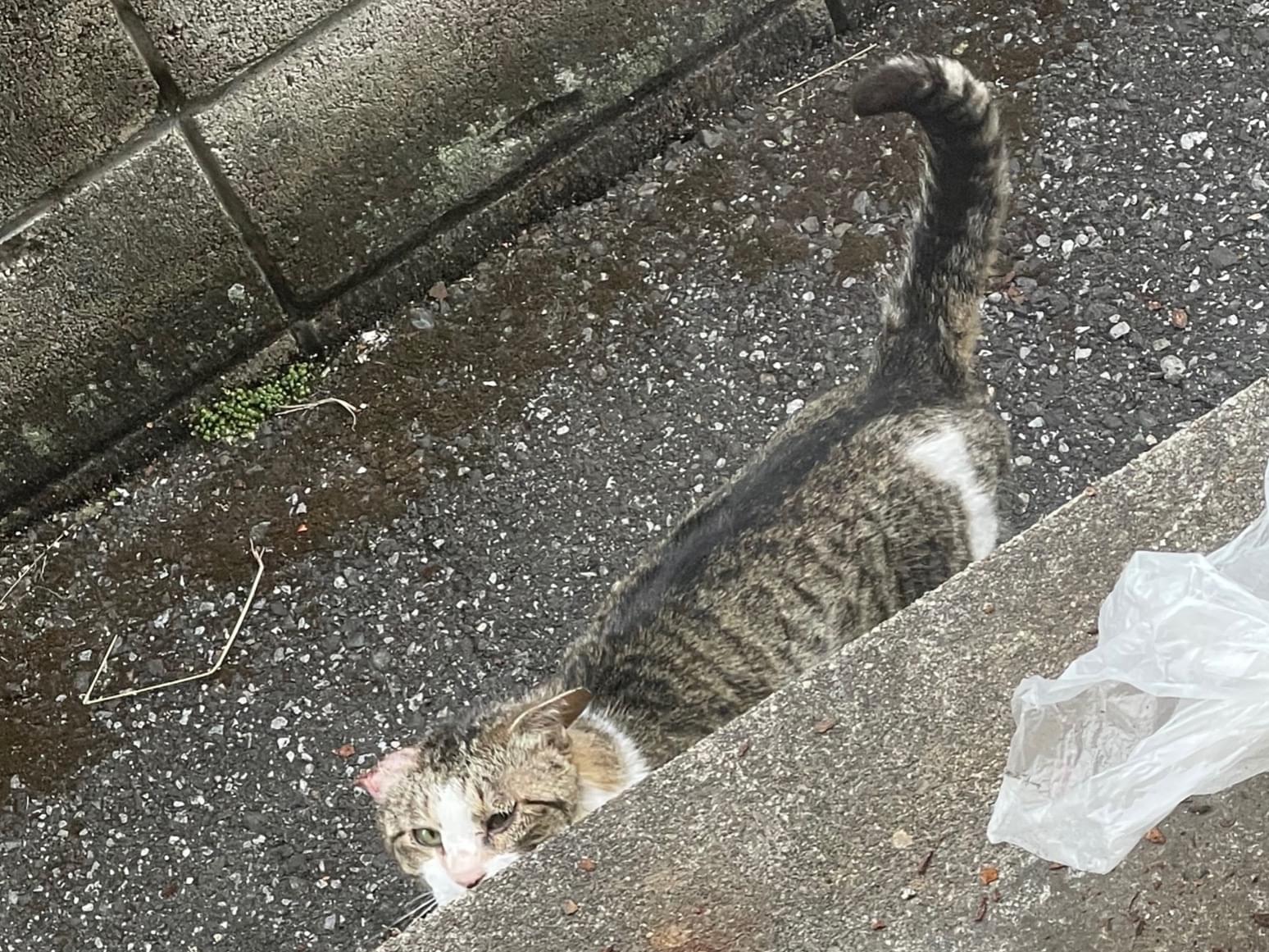 このアパートでよく見かけるそうです、人見知りはせず近ずいて来ます。 野良化するとモフっとしたり目が細くなったり数年経つと毛並みの模様も変わります、よく見てあげてください。