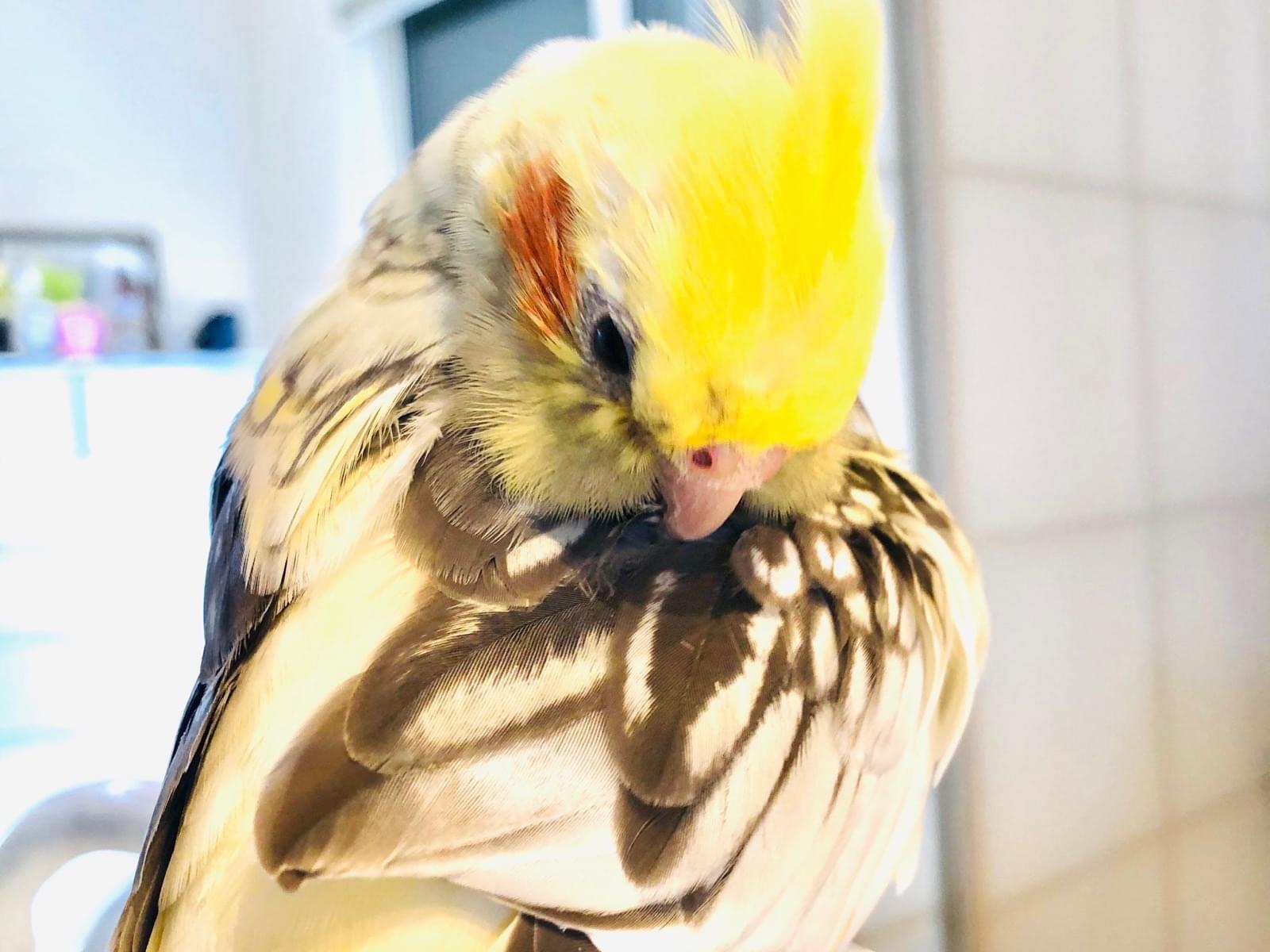 黄色、白、灰色のまだら模様のオカメインコ(パールパイド)です。