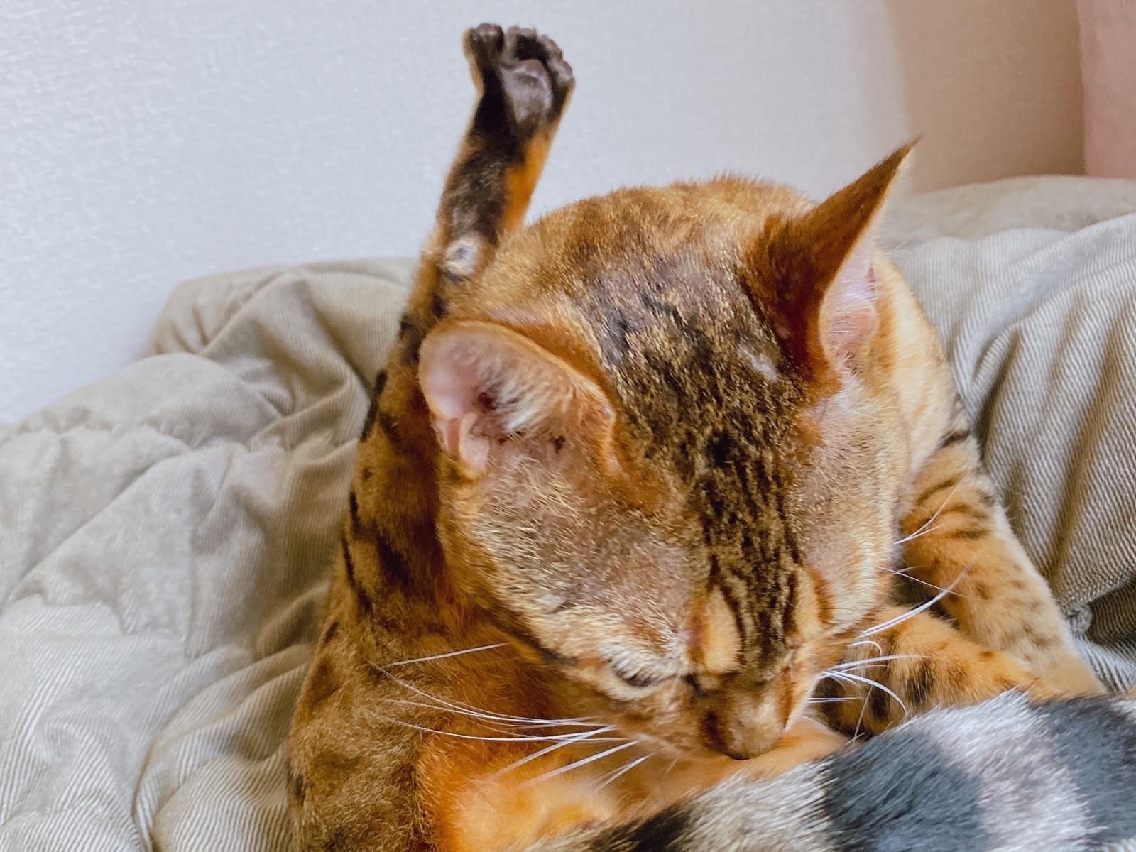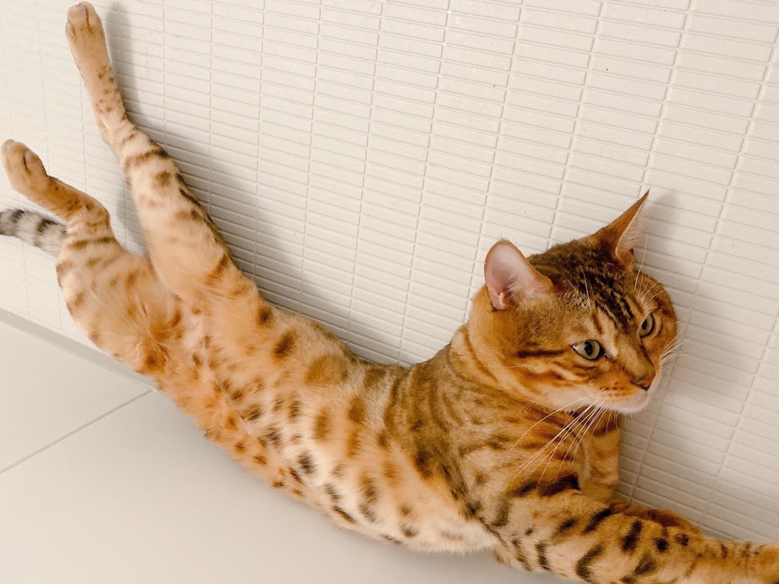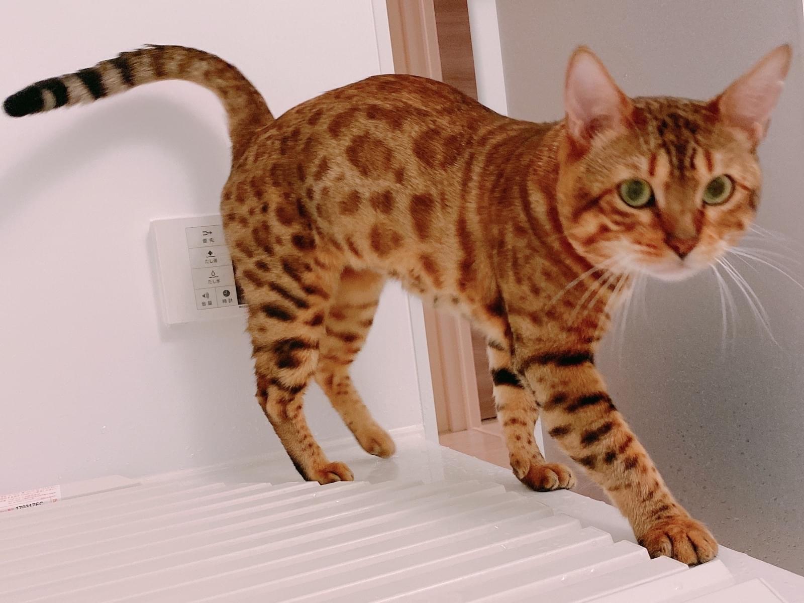 雄猫で未去勢。左耳切れている。かかとが擦れて一部禿げている。尻尾が長く豹柄模様のベンガル。