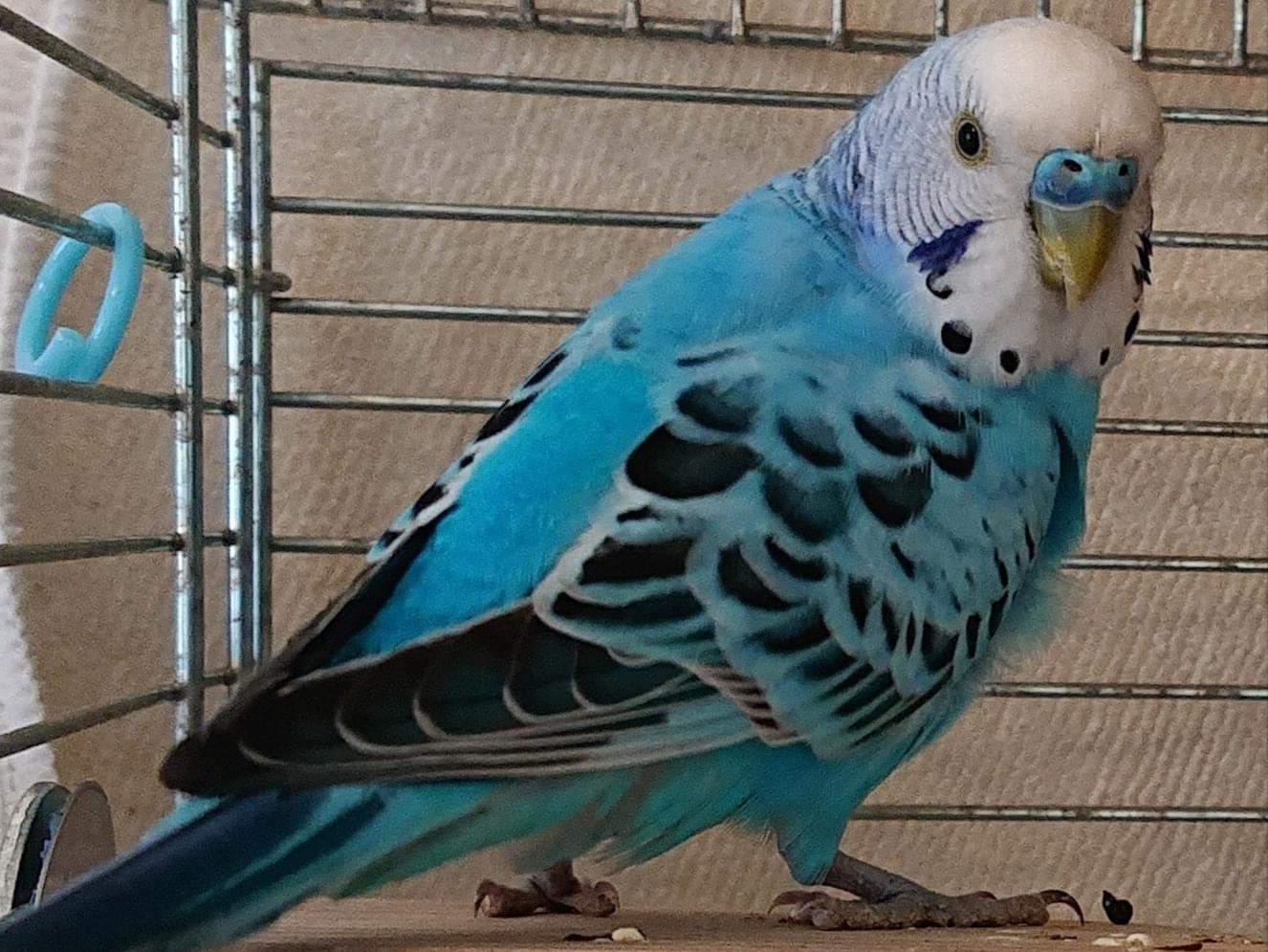 体と鼻が綺麗なブルーのセキセイインコを保護しています。大きめな鳴き声でよく食べ元気です。