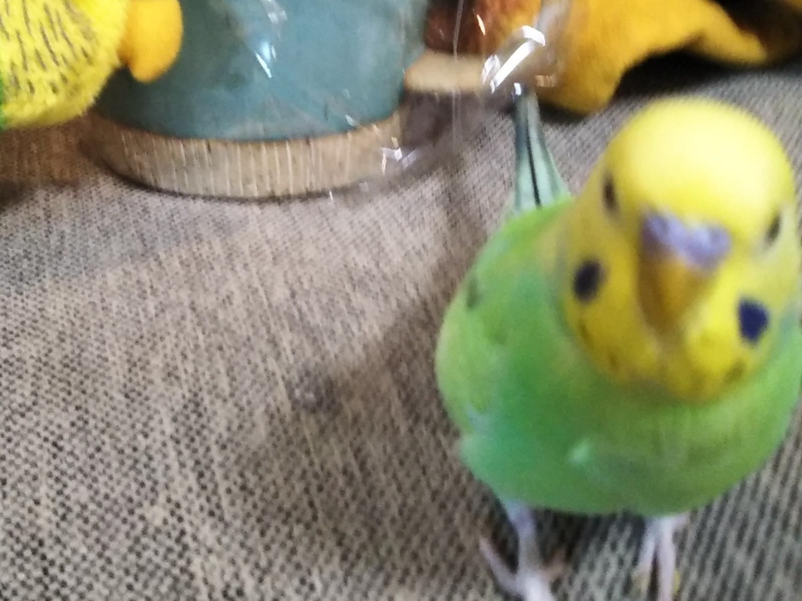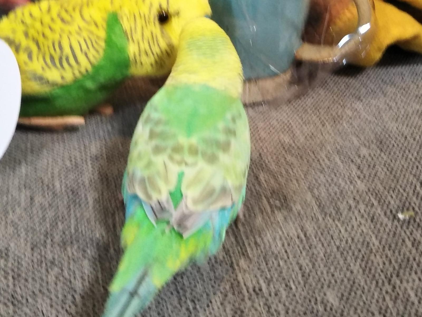 全体が黄緑色 羽は灰色混じり 頭は黄色