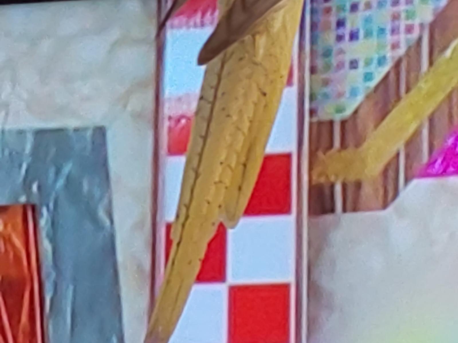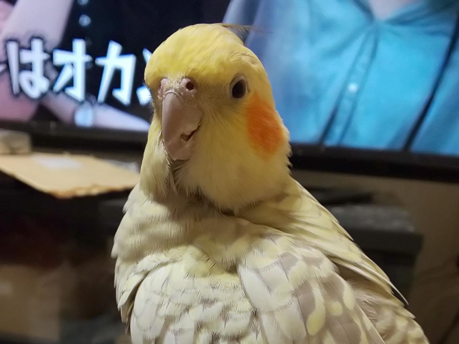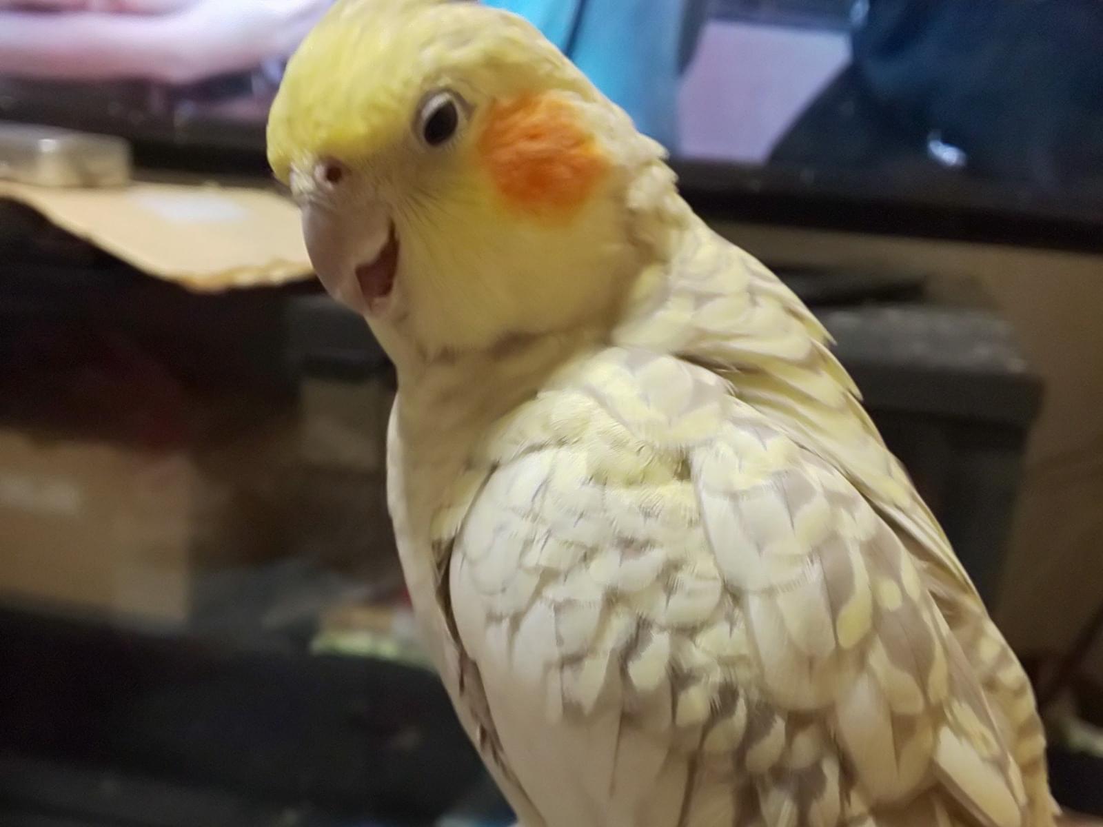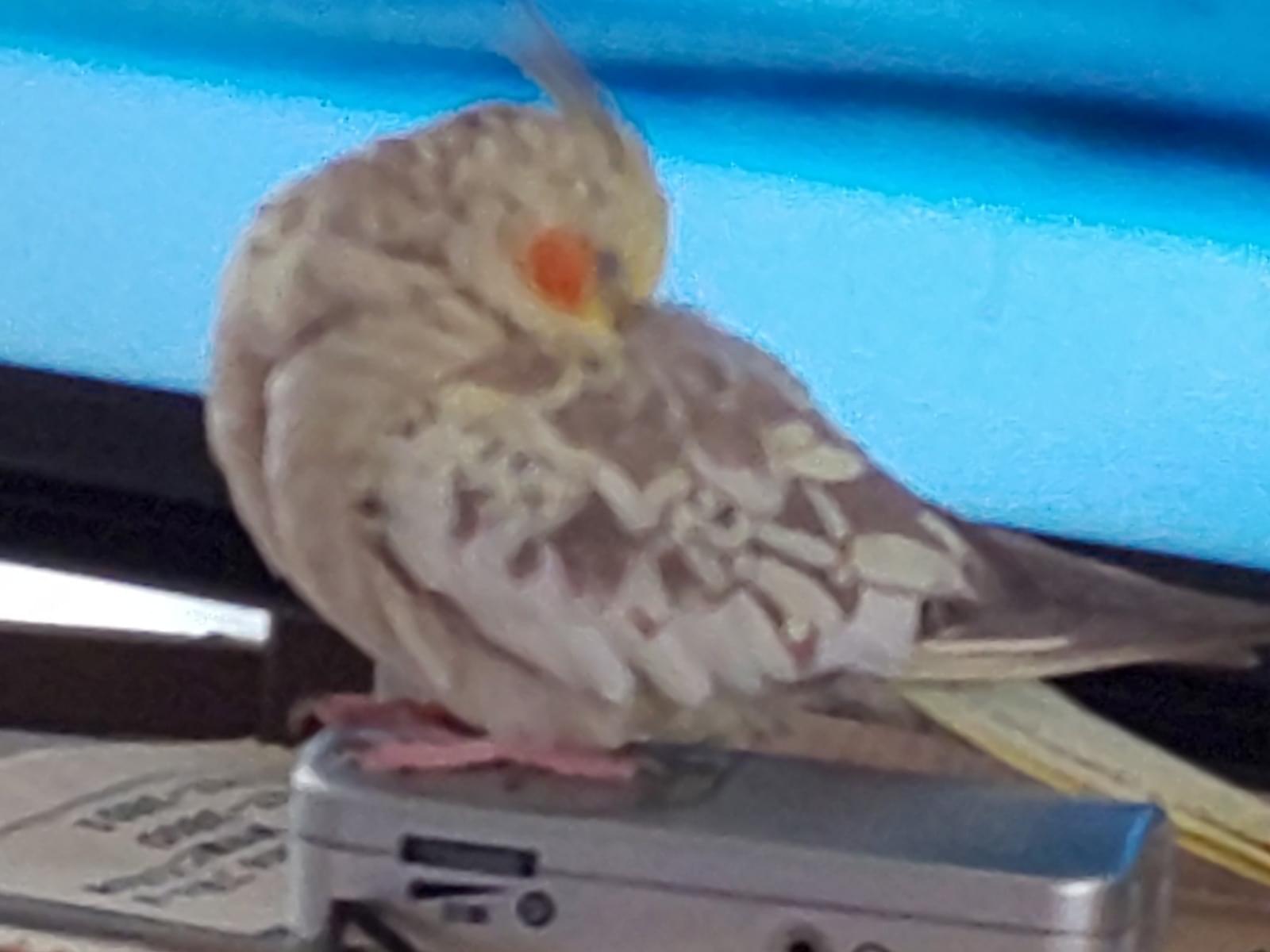 トサカはグレイ。身体は黄色とグレイでパールもようです。頬はオレンジです。