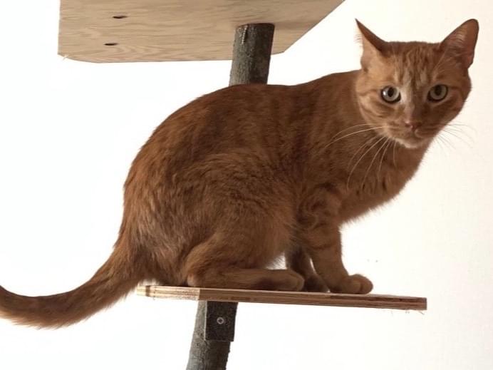 茶トラの細身で、鳴き声は女の子みたいな声です