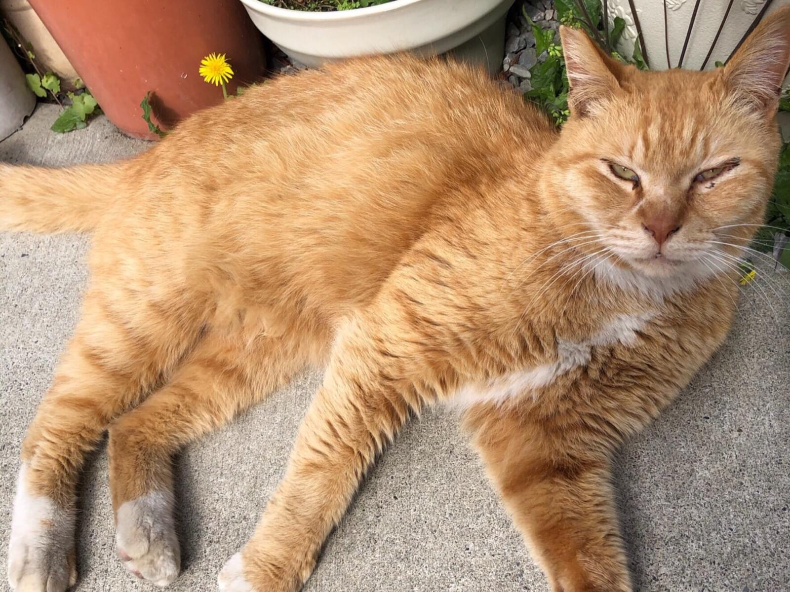茶トラのオス♂右耳にVカット、首元、胸元、足先は白く、尻尾は長くまっすぐです。