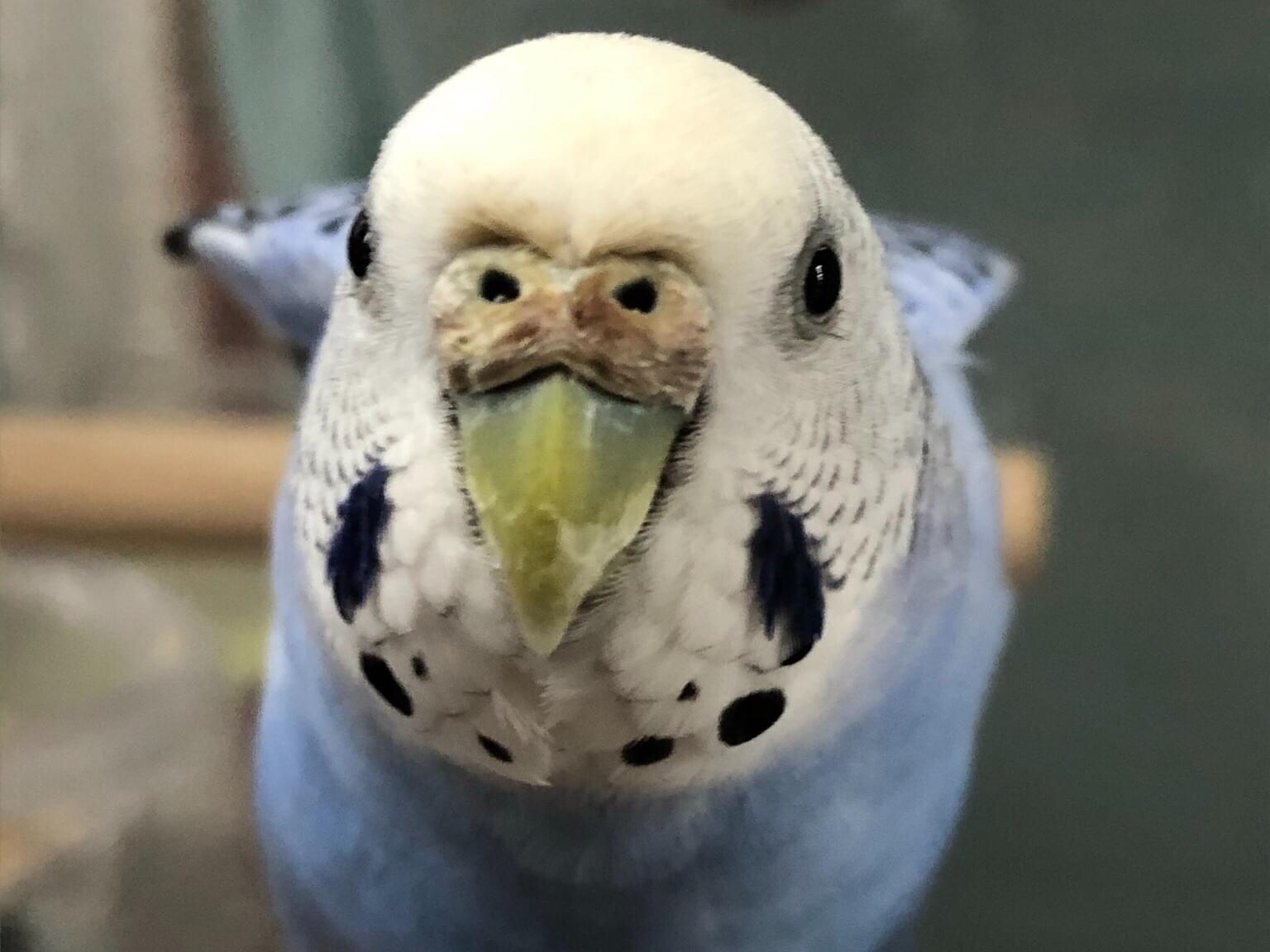 ろう膜はやや茶色、嘴は緑っぽいです。羽は切っていません。