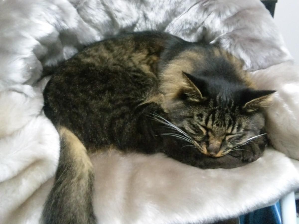 見えにくいかもしれませんが、水色の首輪を、しています。