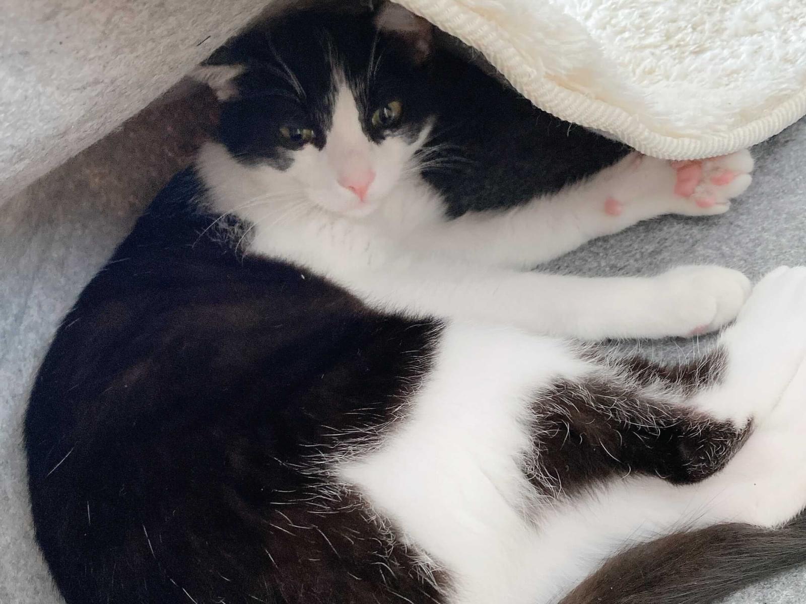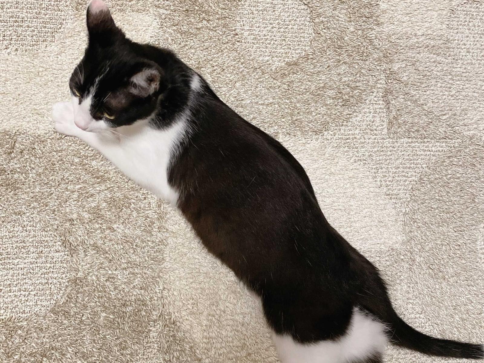 【特徴】白黒はちわれ。しっぽの先が白。白い首輪で緑の鈴をつけています。左耳は桜カットしています。