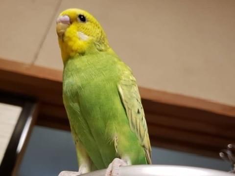 顔全体が黄色く、体は緑の抹茶いろです。鼻は少し青かかっている、ウイングと言う種類で、ななはよく鳴きます。噛み付く癖がありますが、甘噛みもします。とまり木に乗ってるとたまに足をグーにするのが癖です。見つけて頂いた方、保護して頂いてる方いましたら、ご連絡ください。