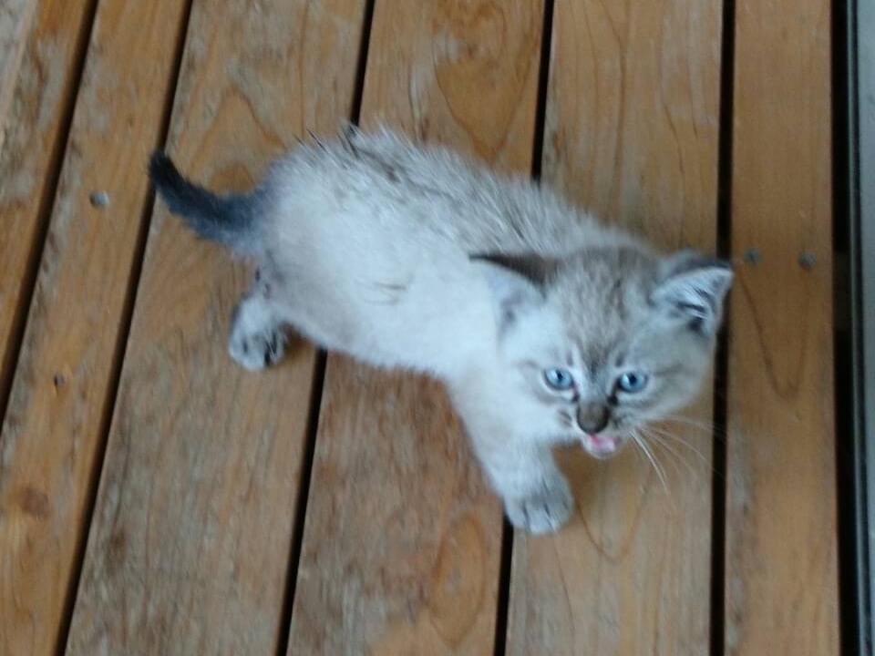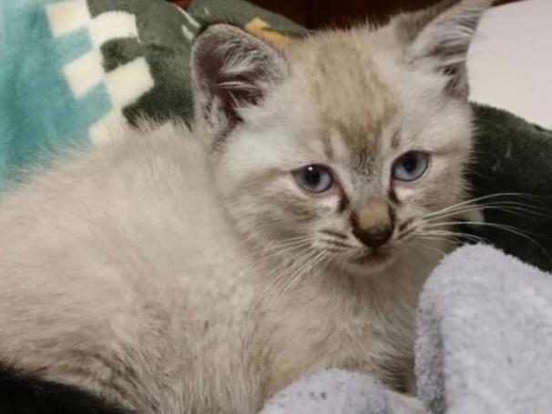 首輪はしていませんでしたが身なりからして飼い猫ちゃんだと思います。白色で尻尾の先が黒色です。目は水色できれいな顔をしています。まだ子猫です。