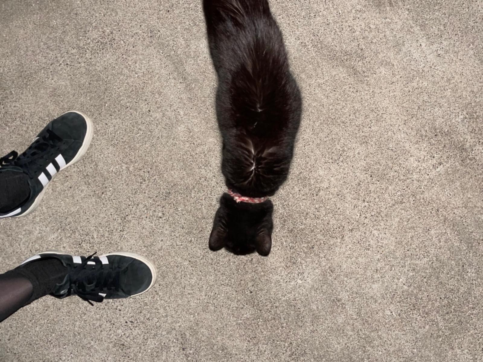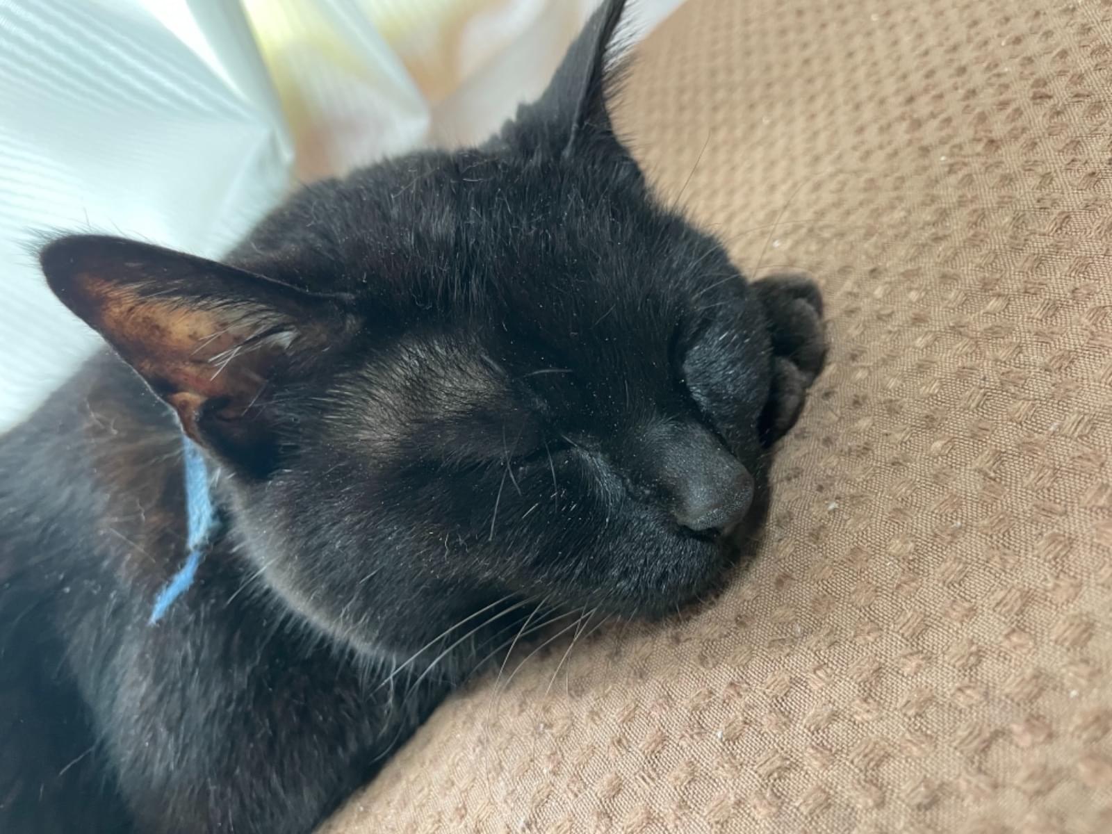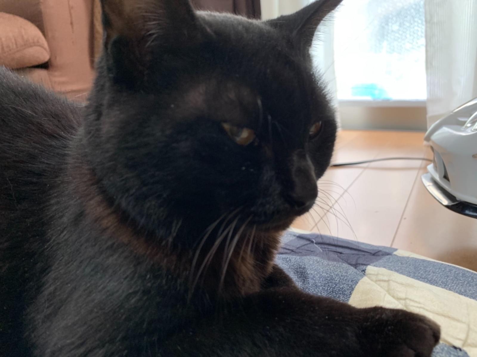 黒猫のメスで青い首輪(もしくは赤)をしています。
