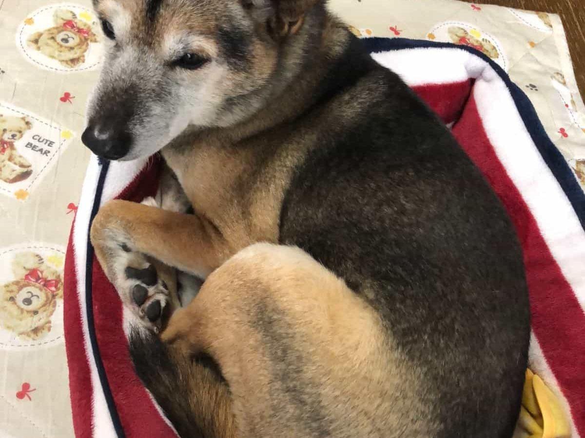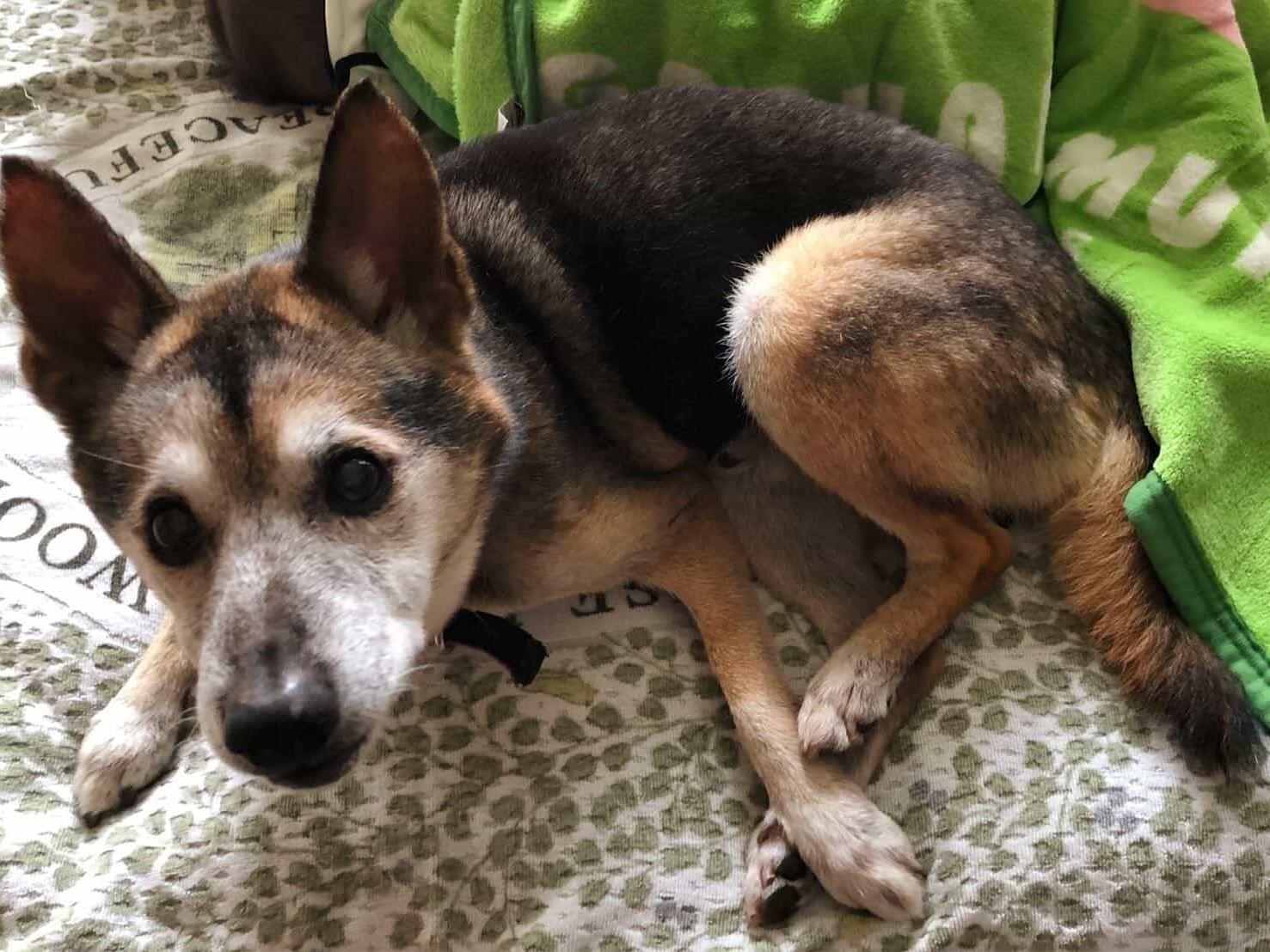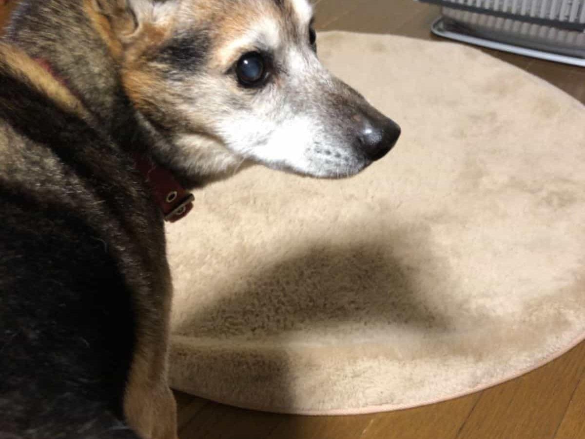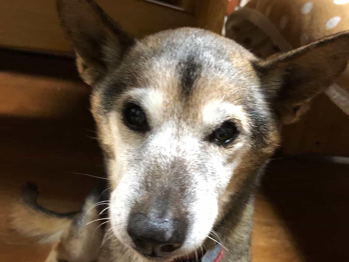 黒と茶色の中型犬。15歳・オス・去勢はしていません。赤い首輪と赤いハーネスを付けています。目がよく見えず耳も遠いので名前を呼んでも反応しないかもしれません。性格はおとなしく、無駄吠えもしません。女性と子供が好きですが男性は苦手のようです。