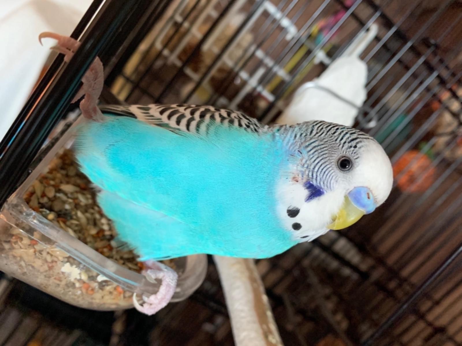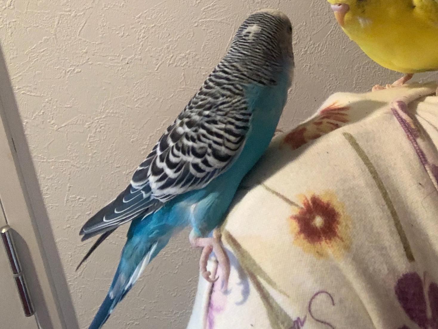 足が開いているペローシス という病気ですが、飛ぶのは上手です。後頭部にハートマークのような白い模様があるのが特徴です。