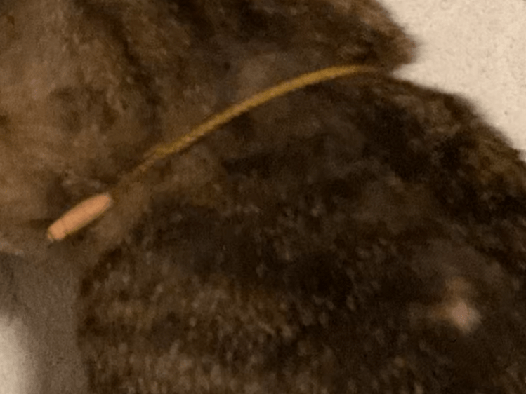 8月下旬?くらいに気づいたのですが、首に黄色っぽい細いヒモがついています。