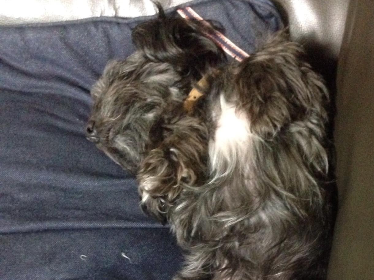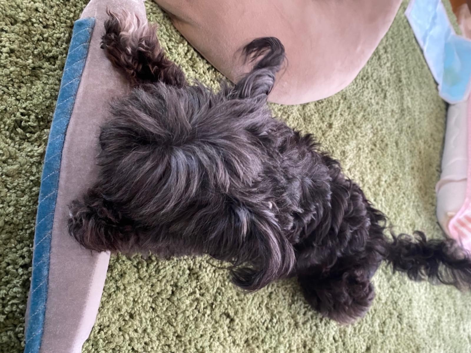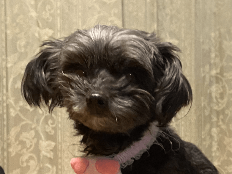 人懐っこいです。黒い毛に白いポイントがあって、グレーのような毛色です。チワワとトイプードルのミックスでくせ毛です。鼻のあたまに、白っぽいホクロのような点があり、手足の先は所々白いです。