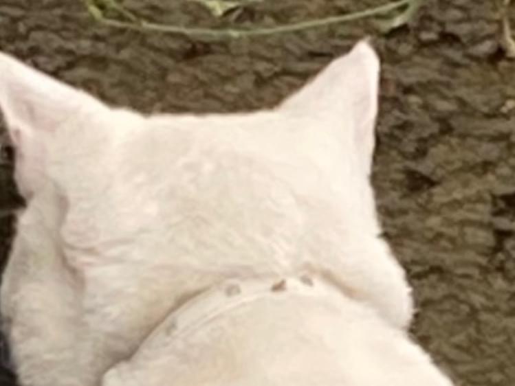 白猫、オッドアイ、白っぽい首輪をつけてます。