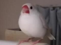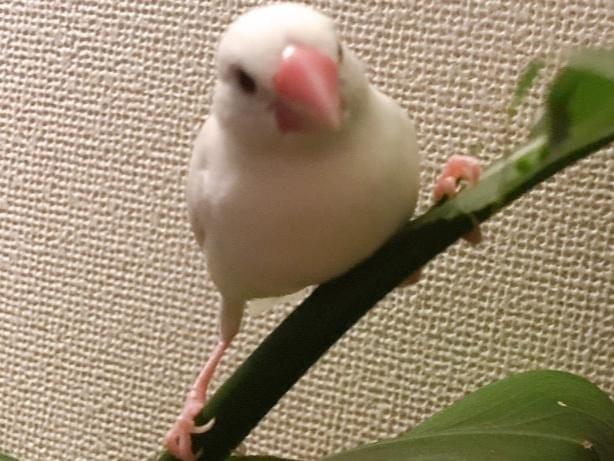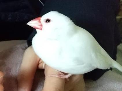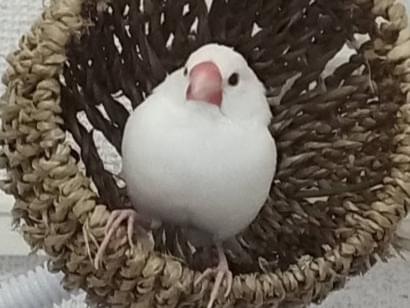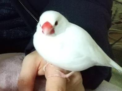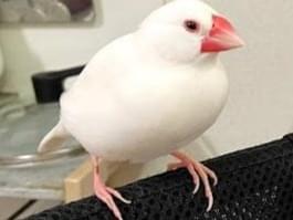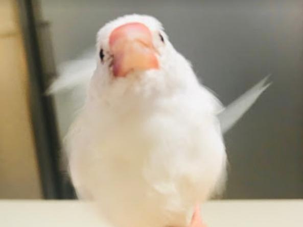 真っ白の白文鳥のオス。もしかしたらぴなちゃんと名前を呼んだら「ぴ」と返事するかもしれません。