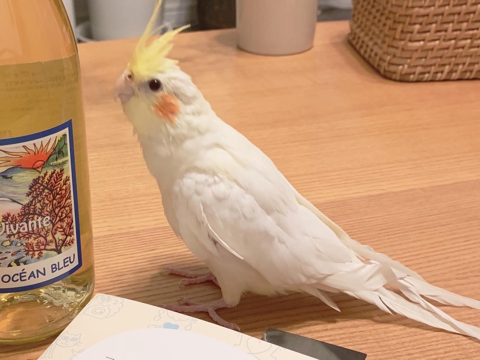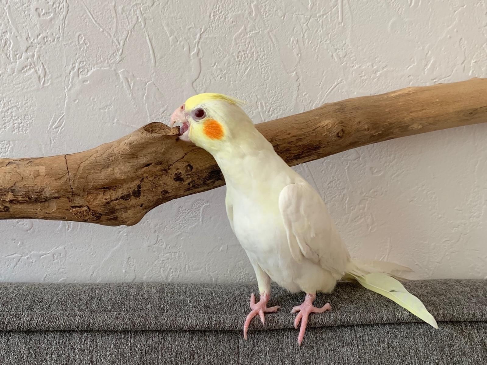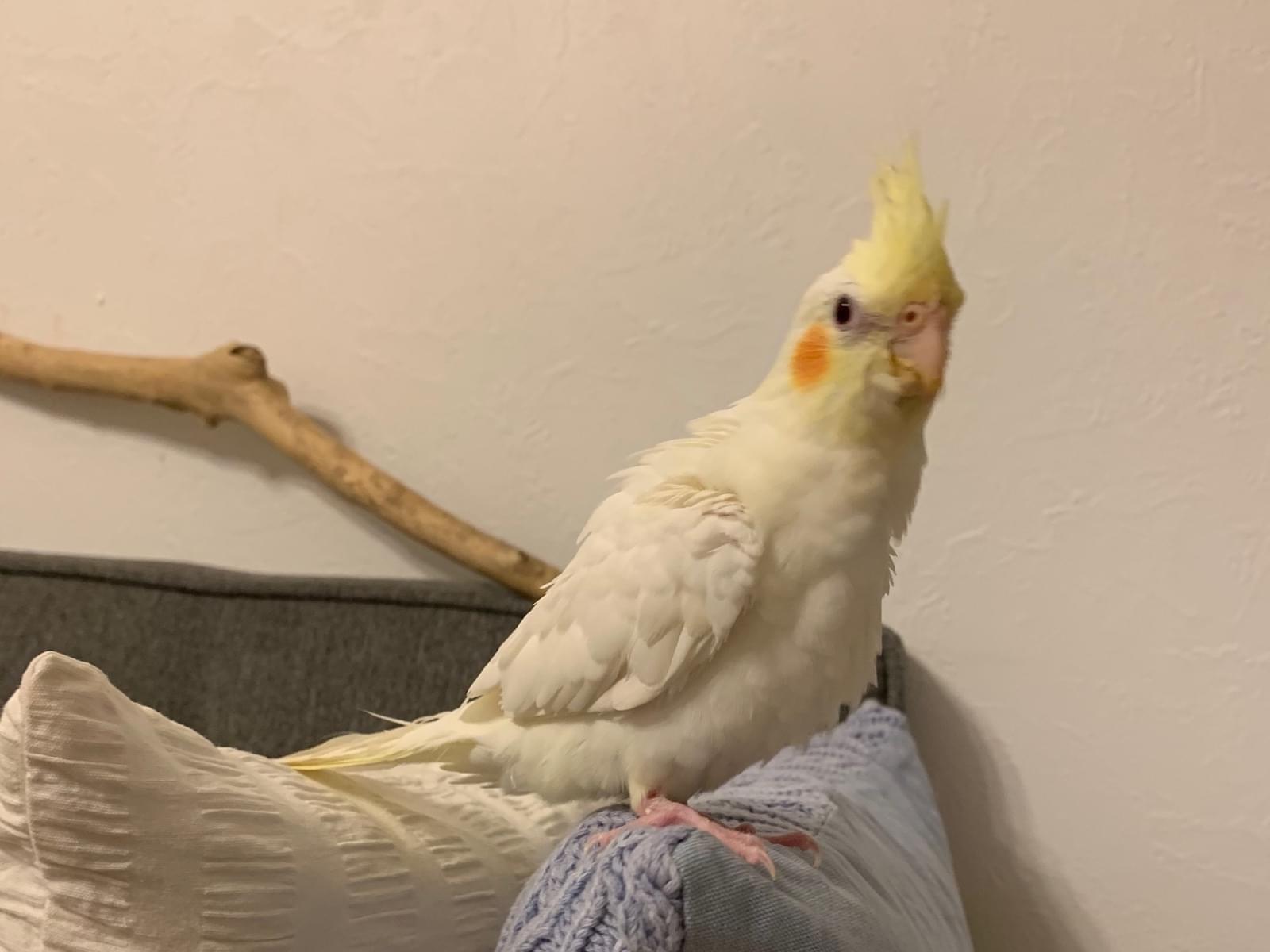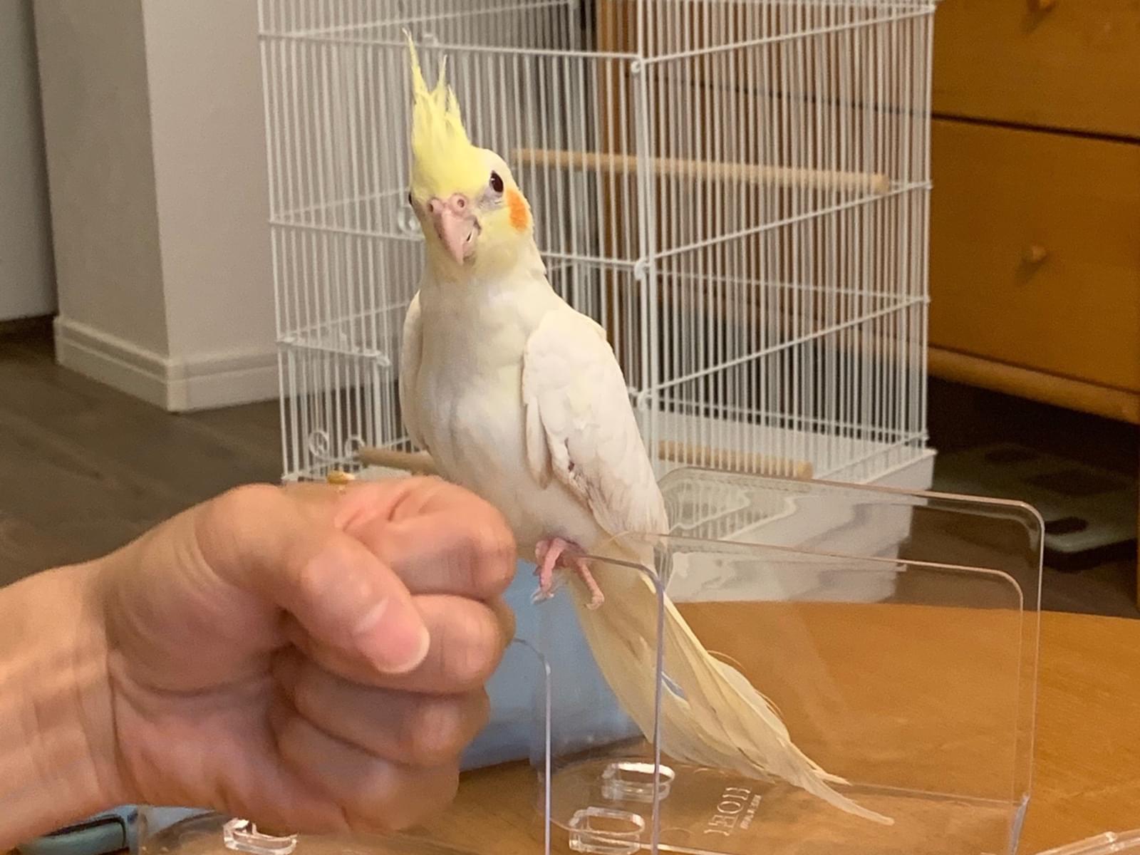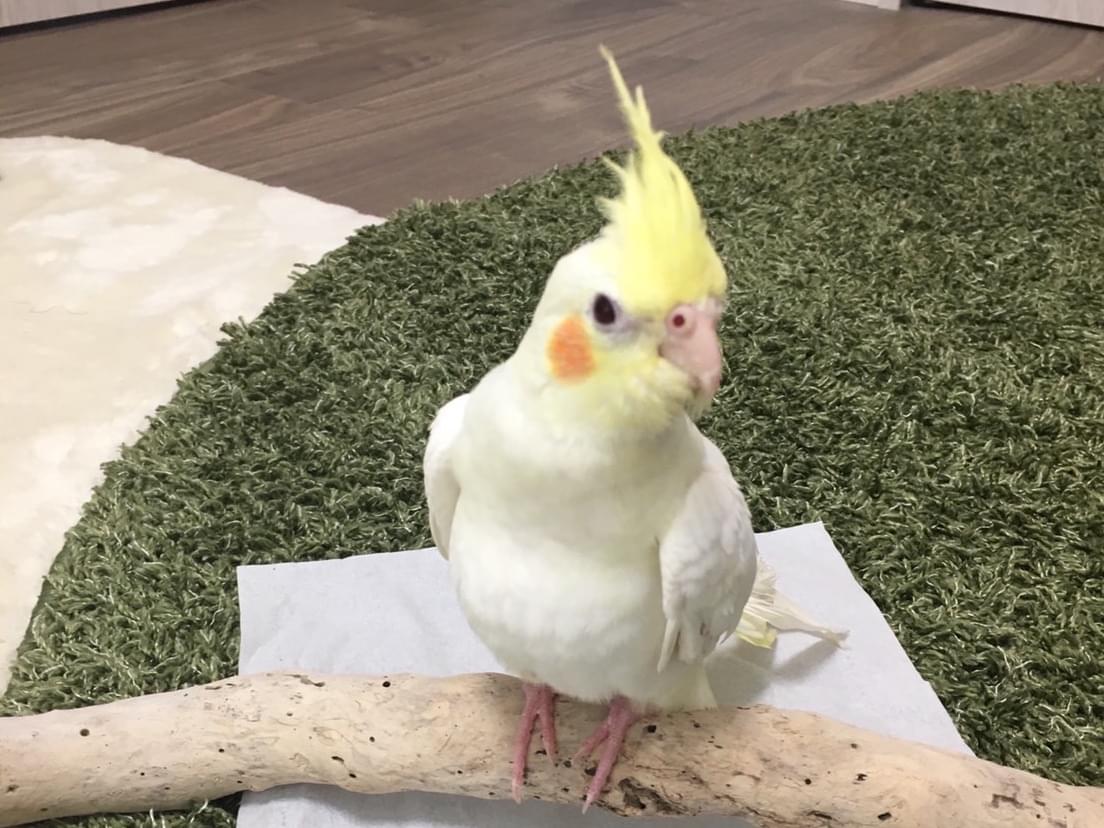特徴は、冠羽と尾羽2、3本は黄色で、全体的には白よりの薄黄色です。ほっぺは薄いオレンジ色です。