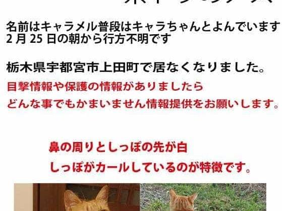宇都宮市上田町で迷子になった茶トラ猫を探しています