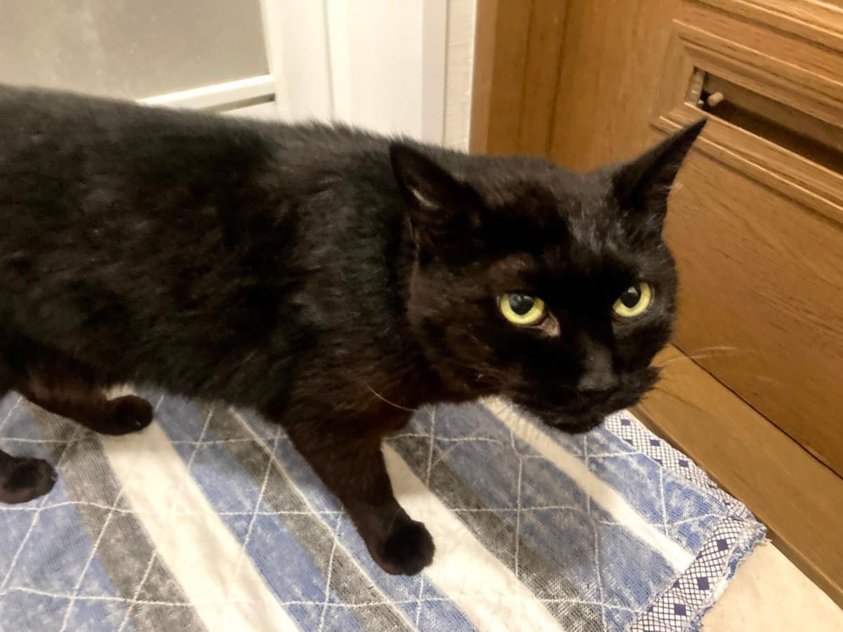 自宅玄関前でうずくまっていたところを保護しました。毛色は黒一色の短毛で模様などはありません。まっすぐで長い尻尾、目の色は黄色です。体重3.6kg。