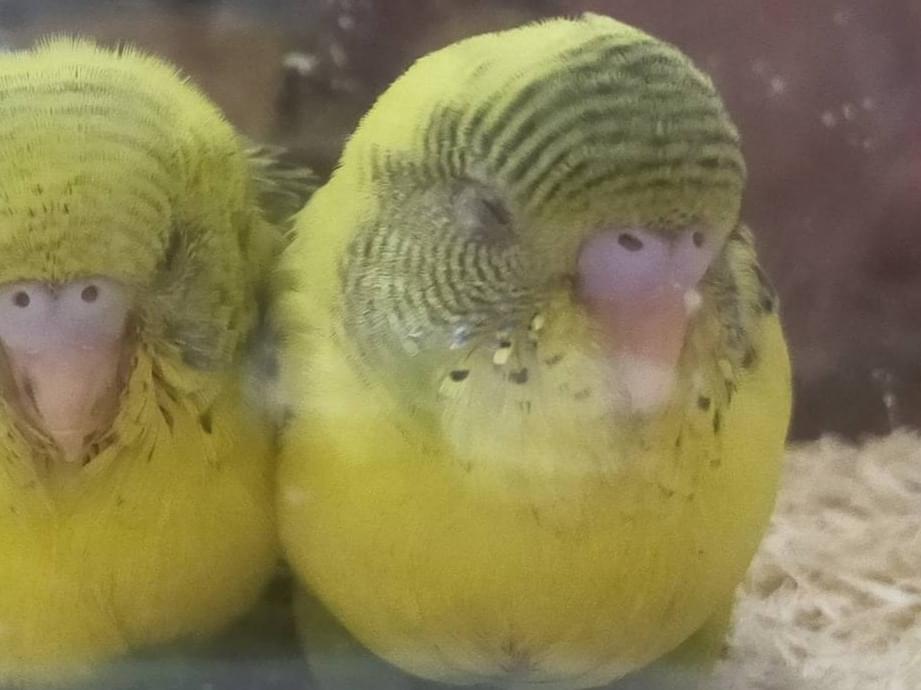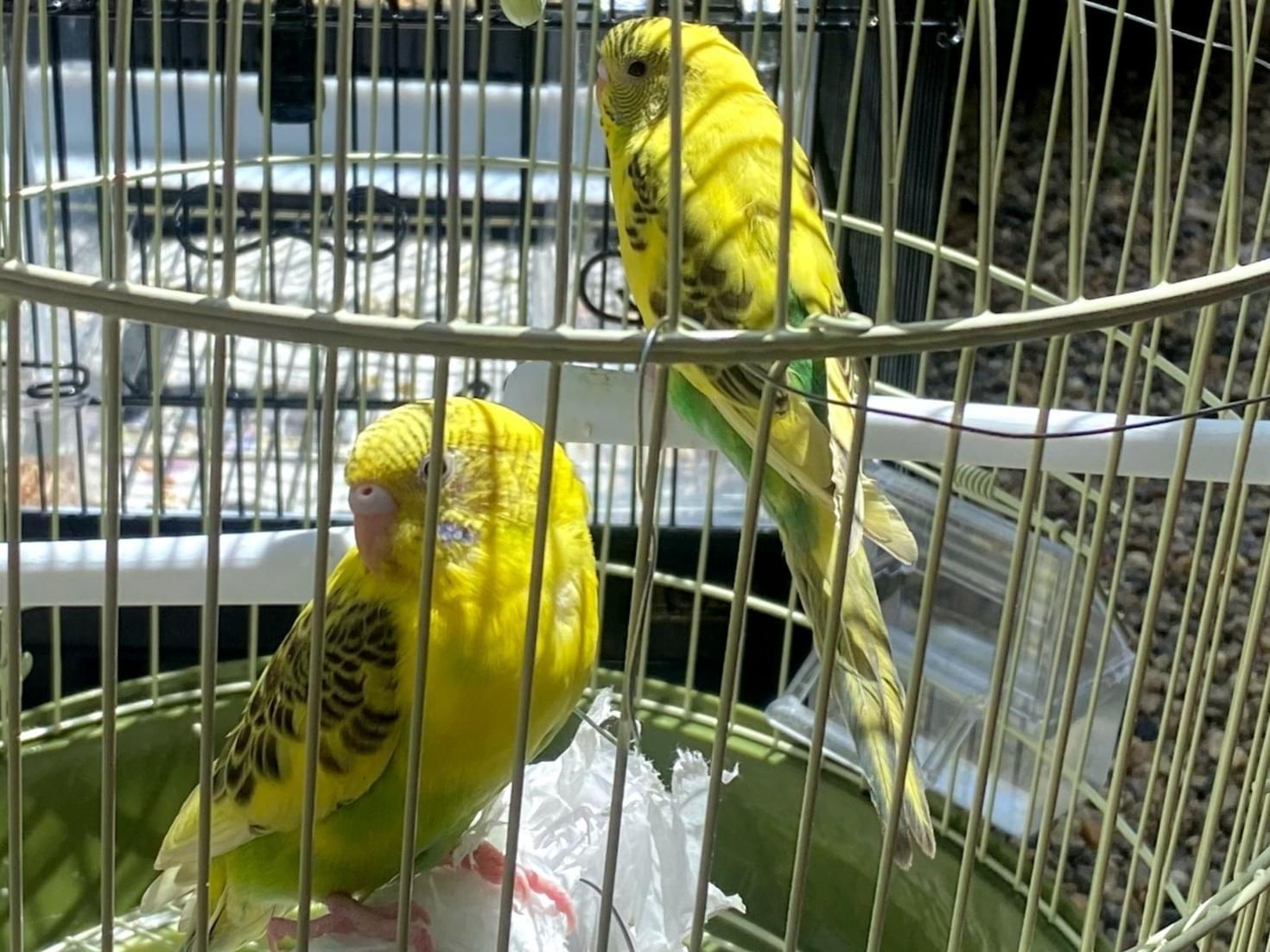 お腹の真ん中から下が黄緑色の黄色いセキセイインコです。チロは濃い黒の縞があります。