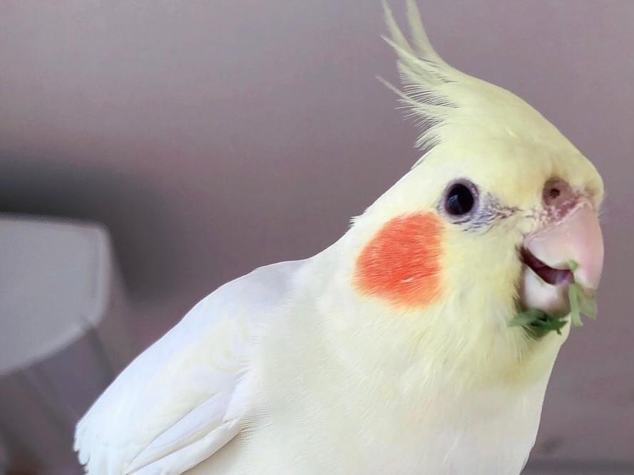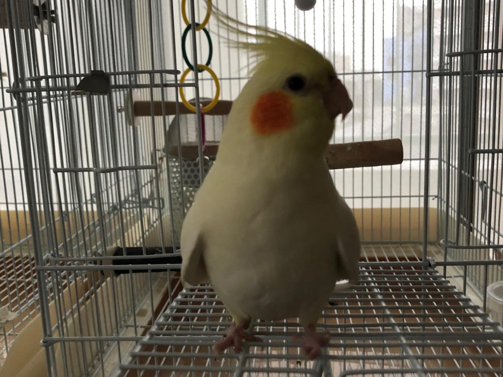 オレンジほっぺのルチノーのオカメインコのむぎ8ヶ月。脚の指が内側に曲がっています。