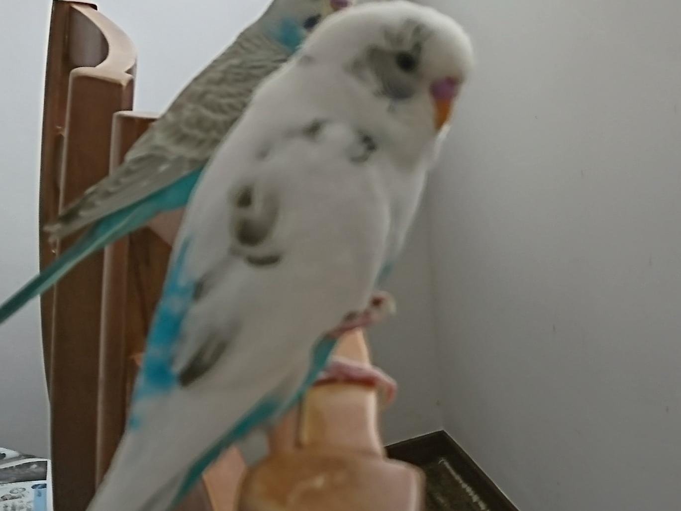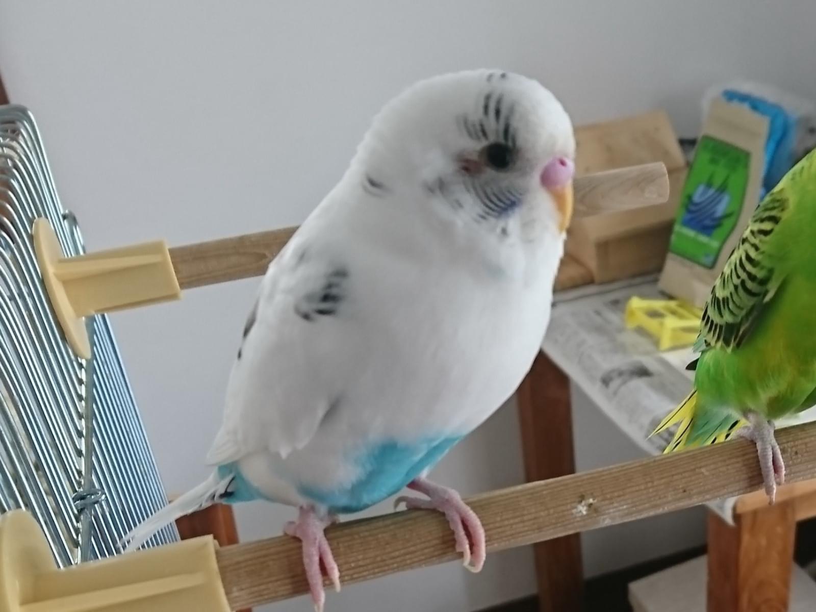 名前はみるくといいます。体の色が白でお腹部分が水色、目の周りと羽に黒も混じっています。