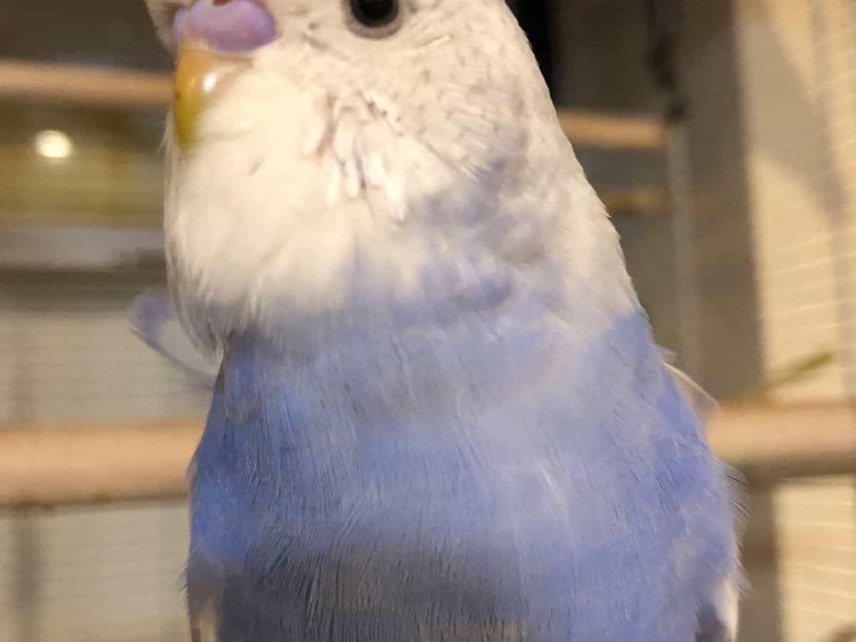 後姿は白がほとんど、前姿は顔が白で体が青、青は紫がかってアンティークのような色です。