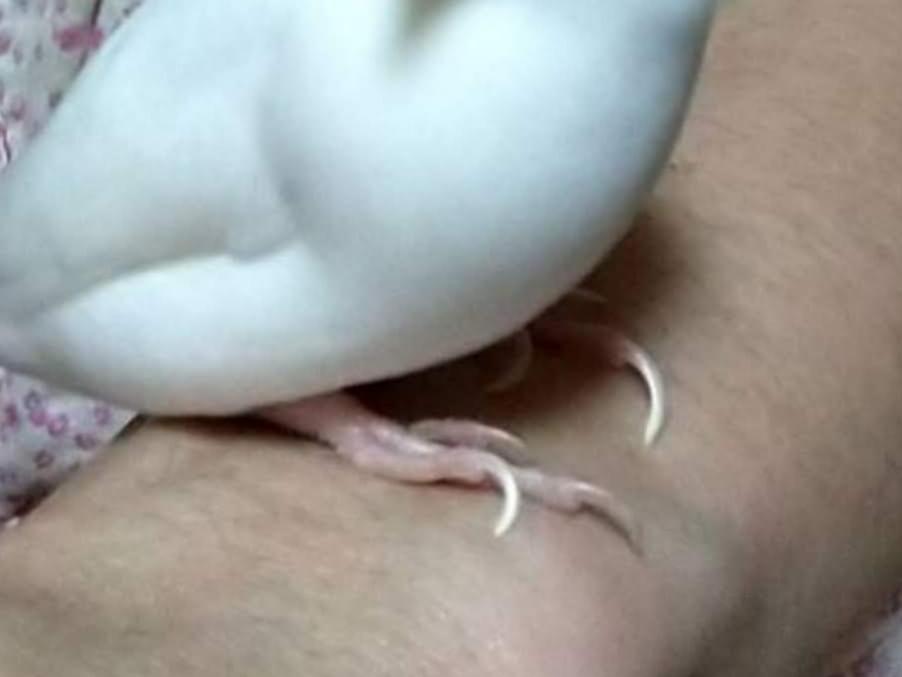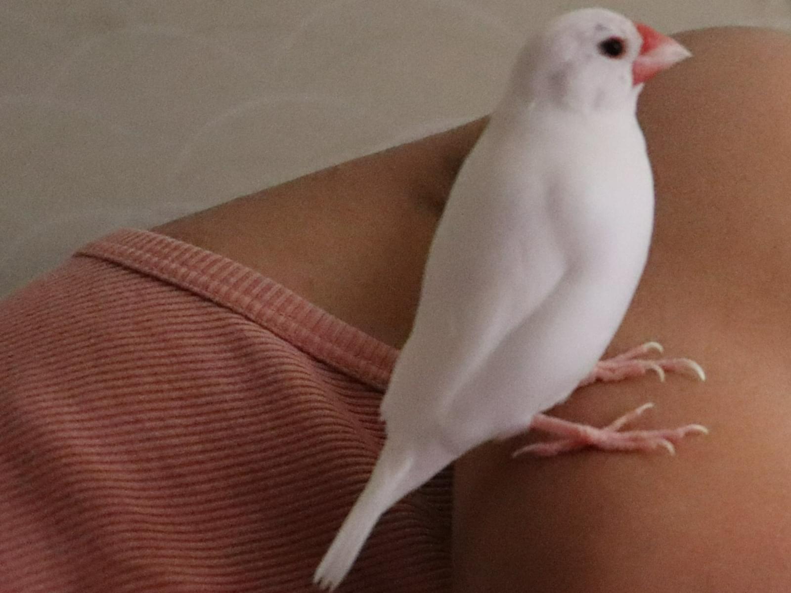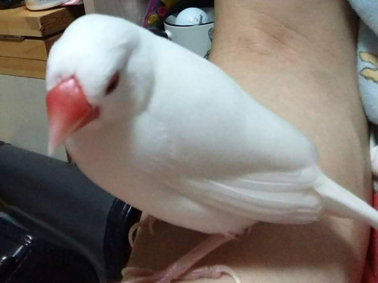 鳥の泣き真似をすると体にとまりにきます。人懐こいです。指を向けると威嚇してつつきますが、卵を持つように手のひらを持っていくと、その中に入ってねんねします。足は白っぽく爪は切っていません。くちばしは先に行くほどしろっぽくなります。じゅんとかちゅんと連呼したら体にとまりにきます。