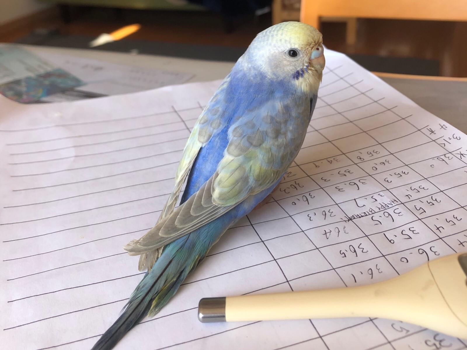 頭は黄色・体は水色と白・尾の付け根が鮮やかな青です。バードテントが大好きで、鳥の声によく反応していました。