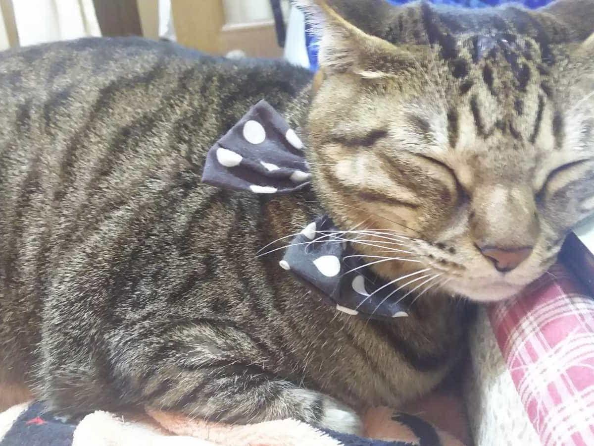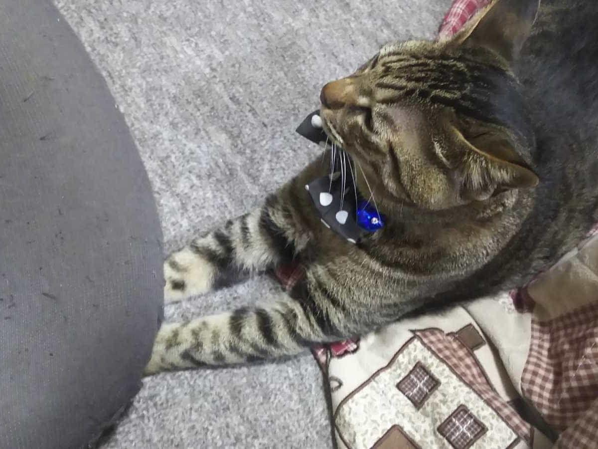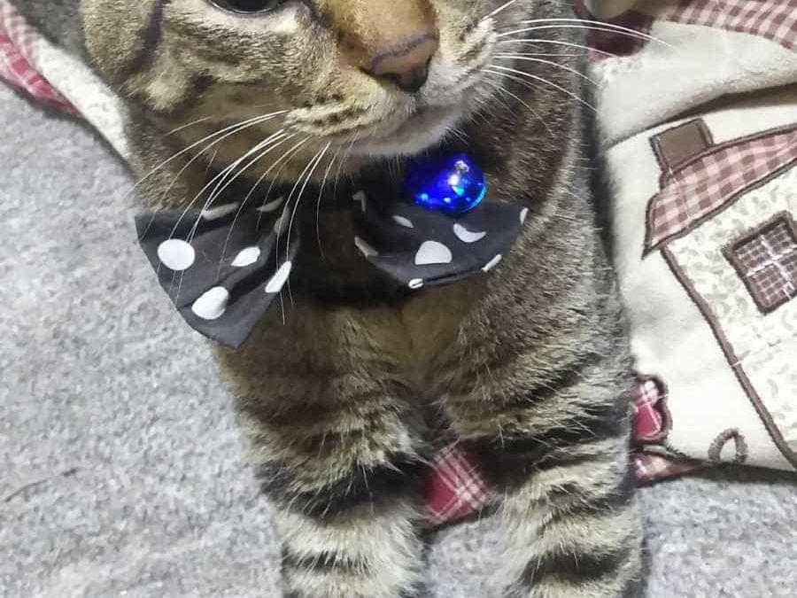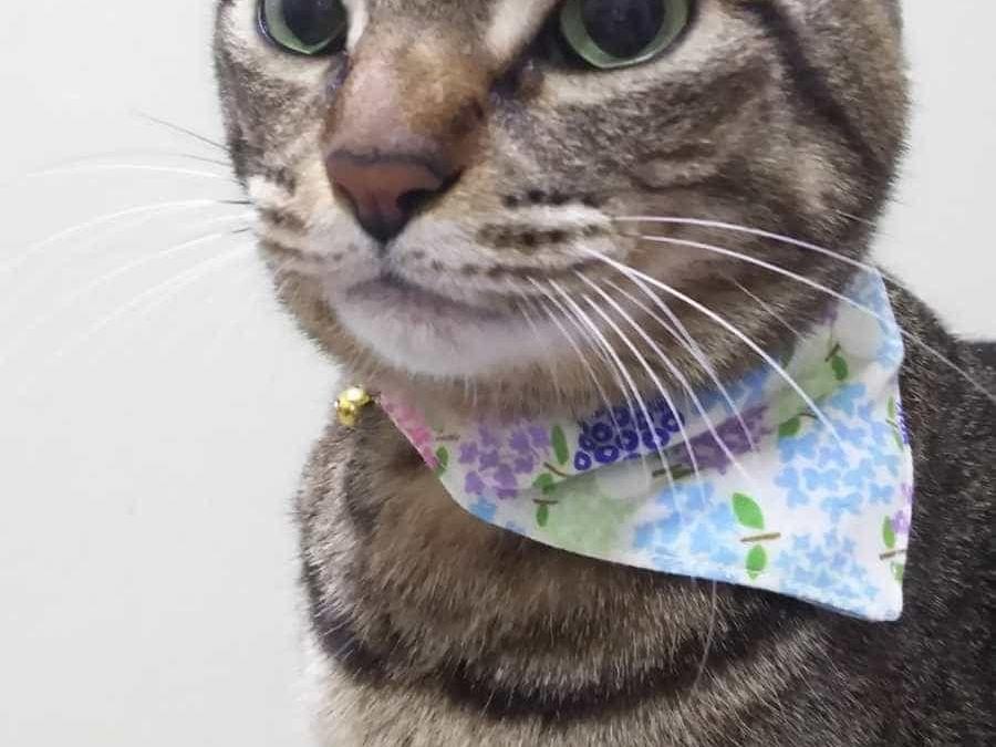 水色のバンダナ付き首輪を付けたキジトラ猫を探してます