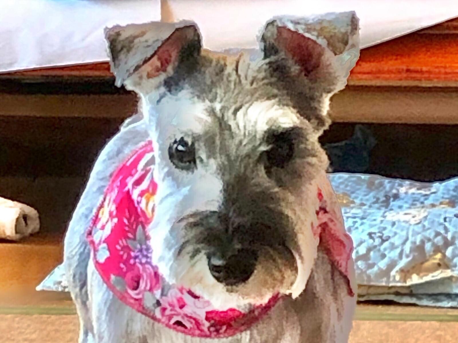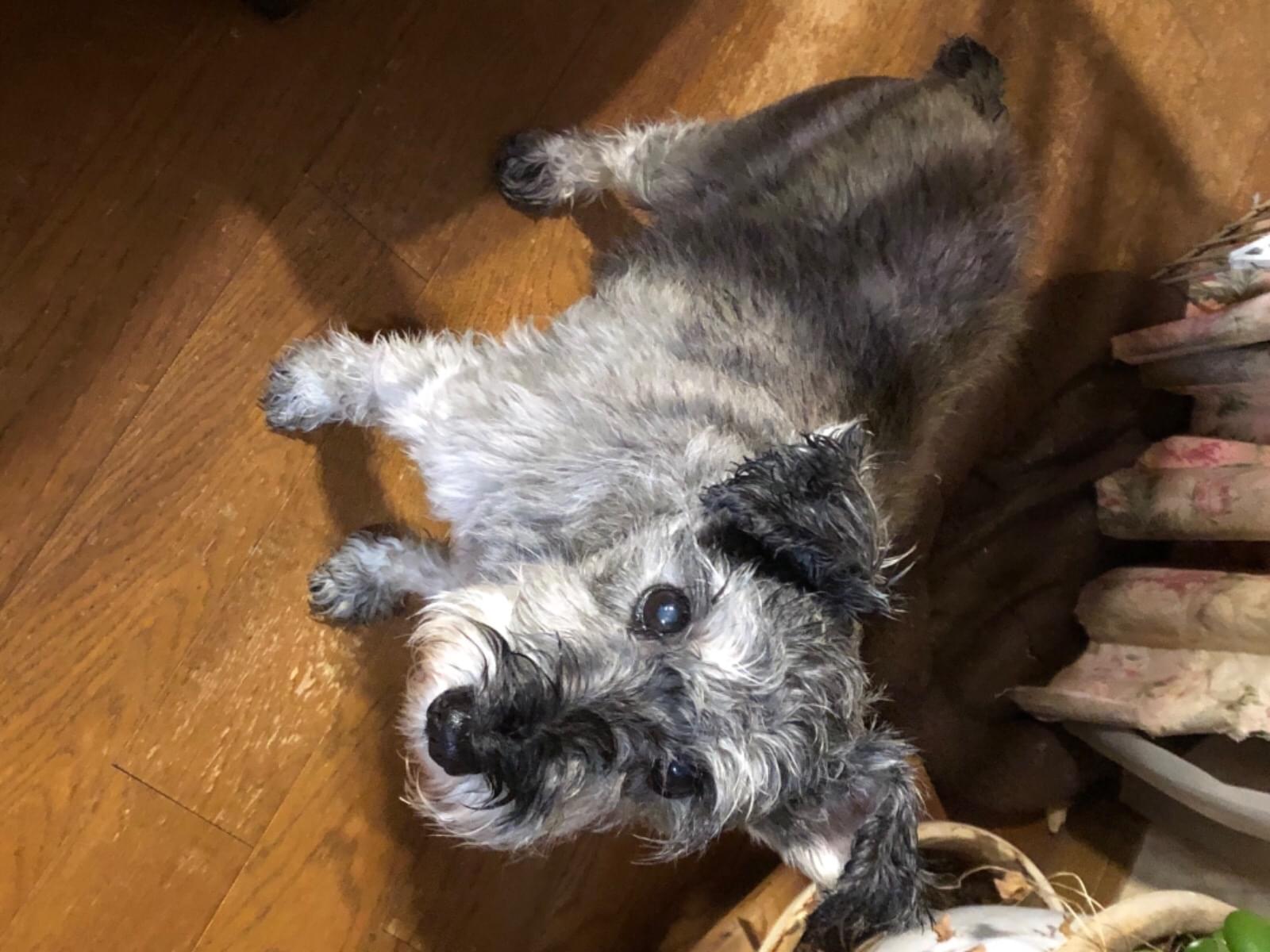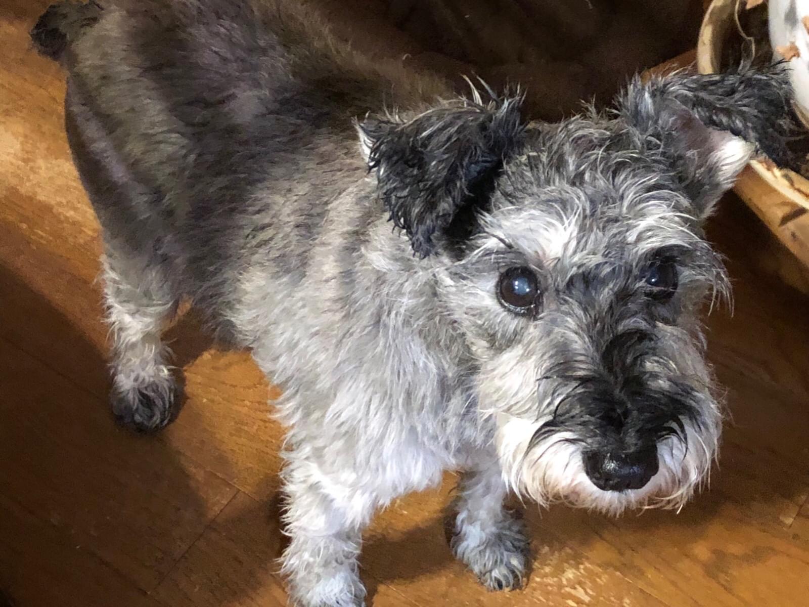 ミニチュアシュナウザーの老犬で、目や耳があまり良くありません。前脚をあげる癖があります。写真のように片耳の先がすぐ垂れます。