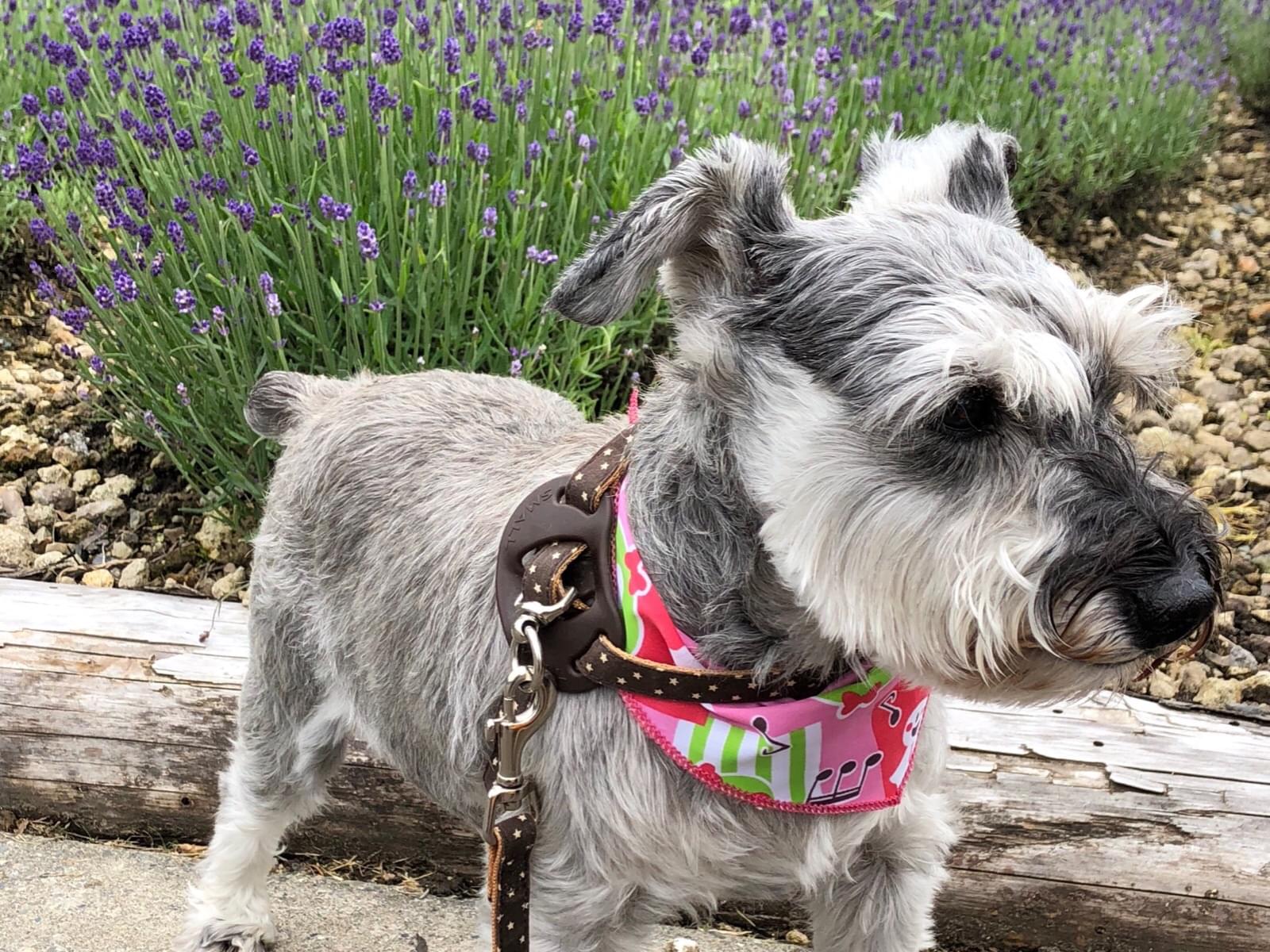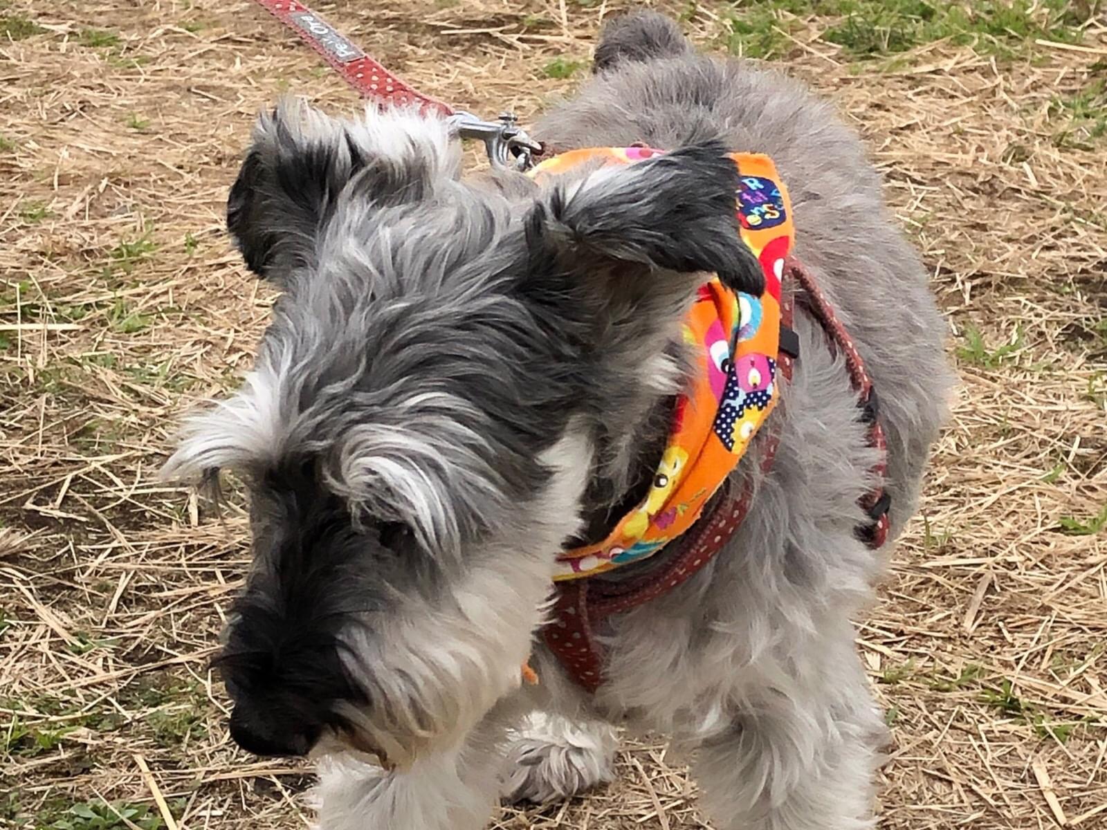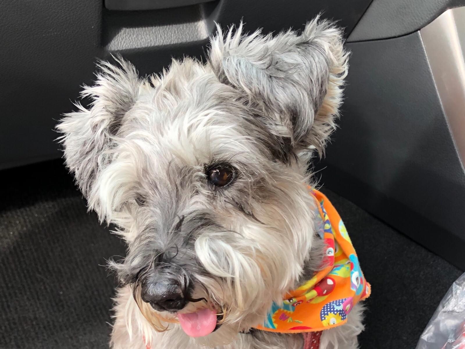 ミニチュアシュナウザーの老犬で、目や耳があまり良くありません。前脚をあげる癖があります。写真のように片耳の先がすぐ垂れます。