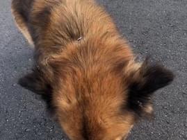 もう1匹はフサフサした毛の、こげ茶と黒の毛のワンちゃんです。このワンちゃんは首輪のような物もしています。