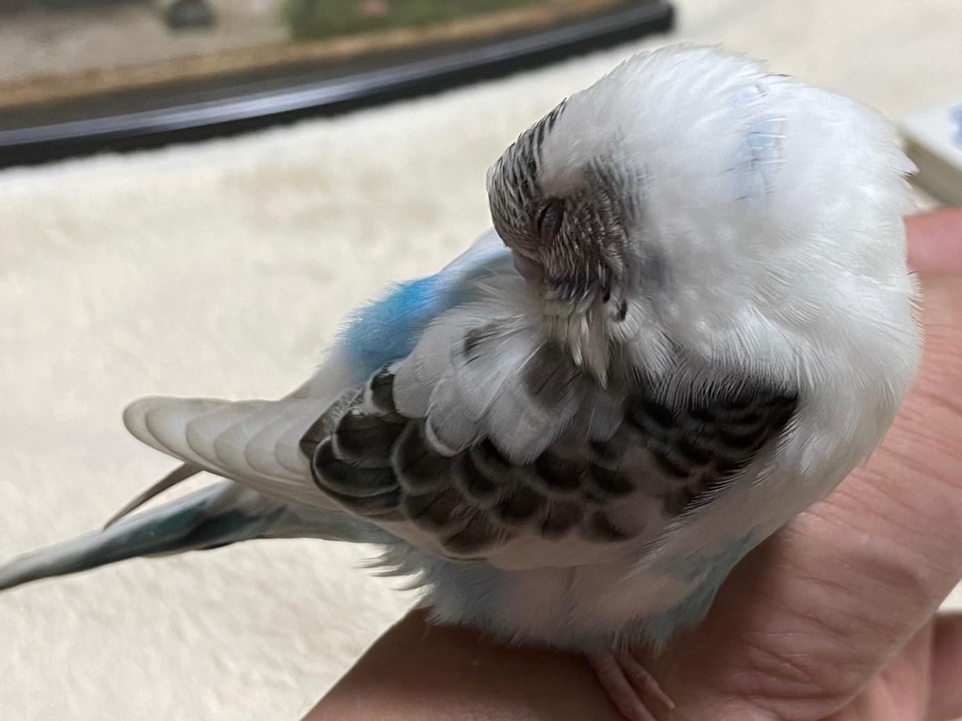 胴体が水色で、羽に黒い鱗のような模様がある白いセキセイインコです。