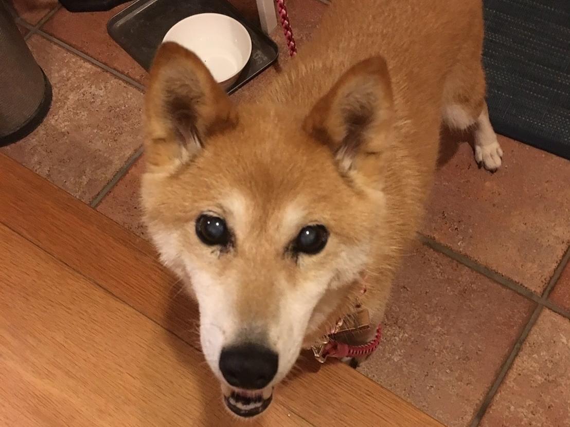 ヤセ型で柴系雑種の老犬です。赤い首輪にハート型のペンダントをしています。認知症です。