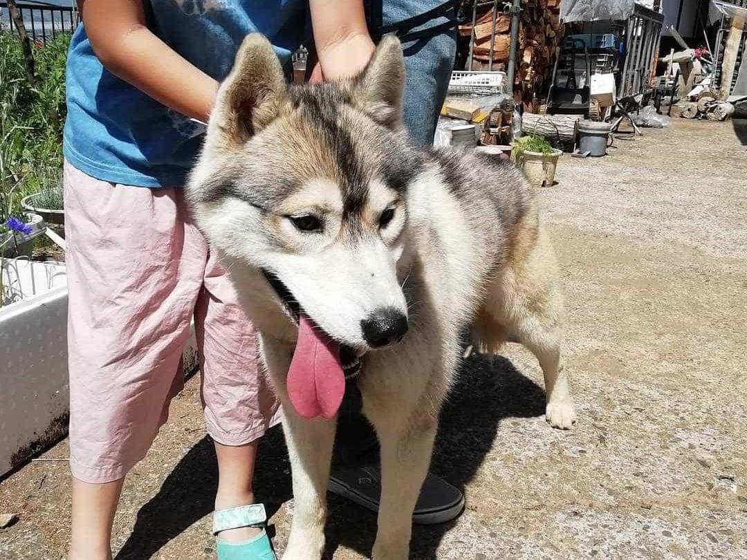 胴輪をしており、そこまで汚れておりません。フルーツラインをお散歩していました。とてもなつっこい小型のハスキーのような顔です。未去勢のオス。毛色はクリームに黒と茶色が混ざっています。