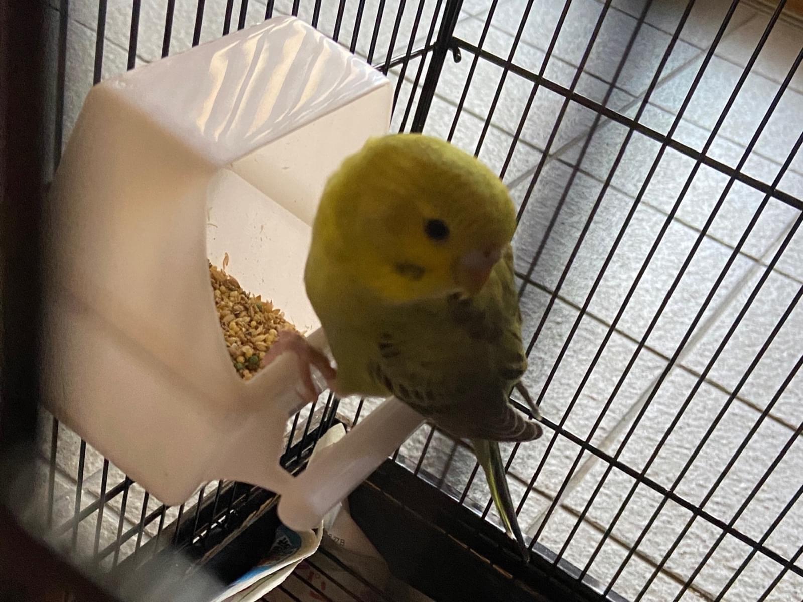 見た目の特徴は特にない、普通の黄色と黄緑のセキセイインコです。やんちゃですがよく人に懐いて肩や頭に乗ります。食いしん坊です。