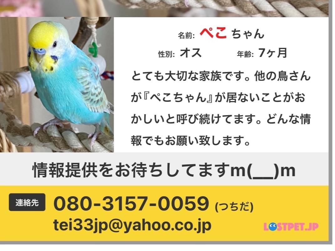 ホーム迷子鳥東京都黄色青のセキセイイン…黄色青のセキセイインコ探してます管理編集するポスター掲載終了最終更新日時:2021/07/28 10:20写真情報用件迷子名前ぺこ性別オス年齢7か月場所東京都 青梅市野上町発生日時2021年7月15日(木)飼い主つちだ説明7/15夕方逃げてしまいました。青梅警察署には届出出していますが、未だ他サイトでも目撃情報も無く心配しております。皆様のお力添えよろしくお願いします。連絡先URL未設定掲示板情報交換のための掲示板です。ユーザーからの情報提供、オーナーからの連絡などにご利用下さいませ。まだコメントはありません。トピックを作成する