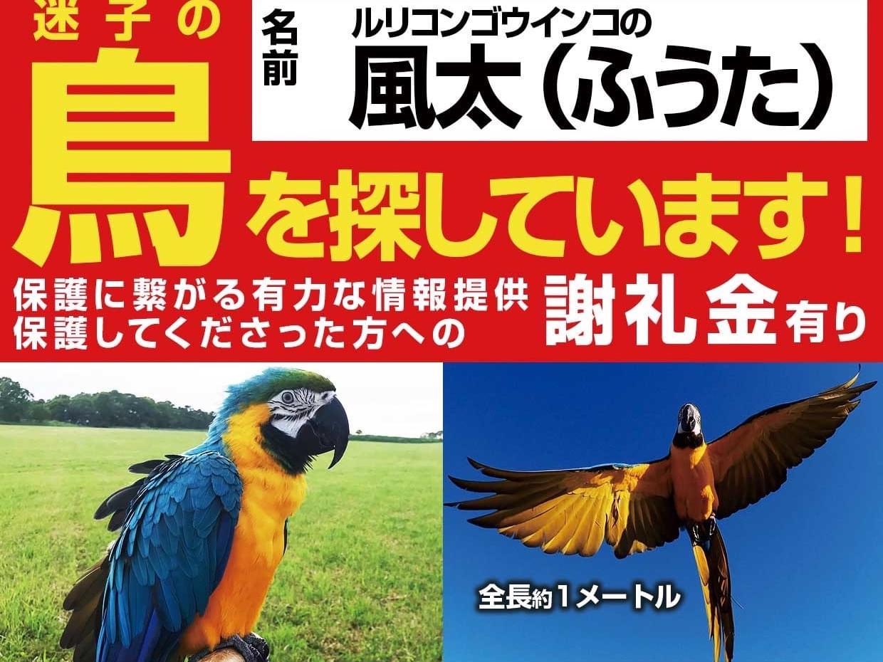 北海道にて迷子のルリコンゴウインコ「風太」を捜しています。
