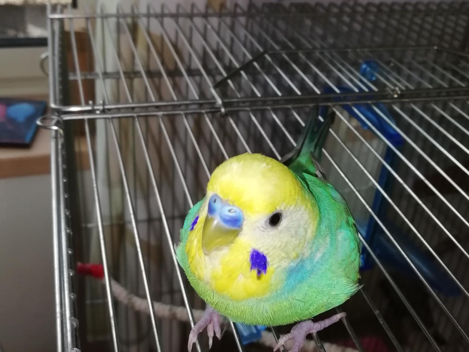 頭が黄色のレインボーの男の子です。手には乗りませんが肩にはとまります。人にはよく慣れています。おとなしい性格で、ふーちゃん、ぴーちゃん大好き、かわいい、など、おしゃべりもします。