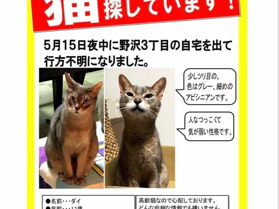 世田谷区野沢で迷子になったアビシニアンの猫を探しています