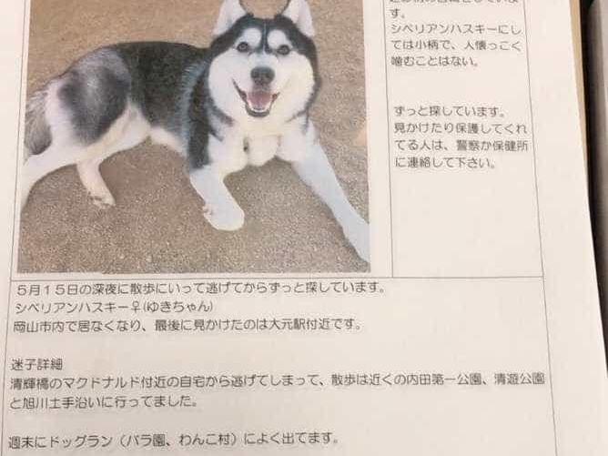 岡山市内で迷子になったシベリアンハスキーを探しています
