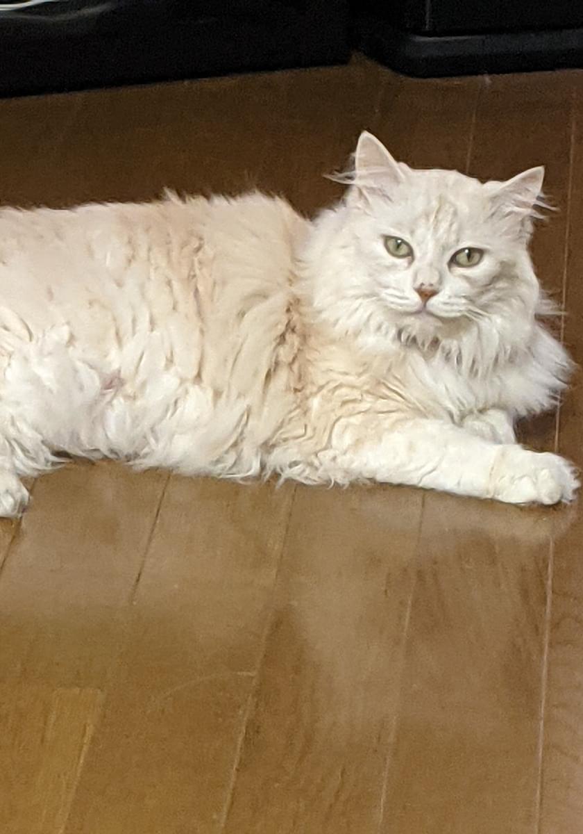 いなくなって1ヶ月たちます。名前と電話番号を記入した赤い首輪をしています。人馴れしていません。ビビリで音に驚きます。4.9キロと大きめです。完全室内飼いだったために帰って来れるか心配してます。42日ぶりに帰って来ました。ありがとうございましたm( )m